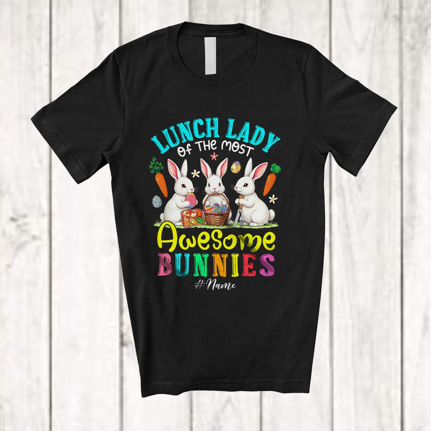 • Personalized Custom Name Lunch Lady Of The Most Awesome Bunnies; Lovely Easter 3 Bunnies T-Shirt. This cotton t-shirt is a durable staple product with a classic fit. One of the most popular items, it has a relaxed style made for everyday and casual wear.