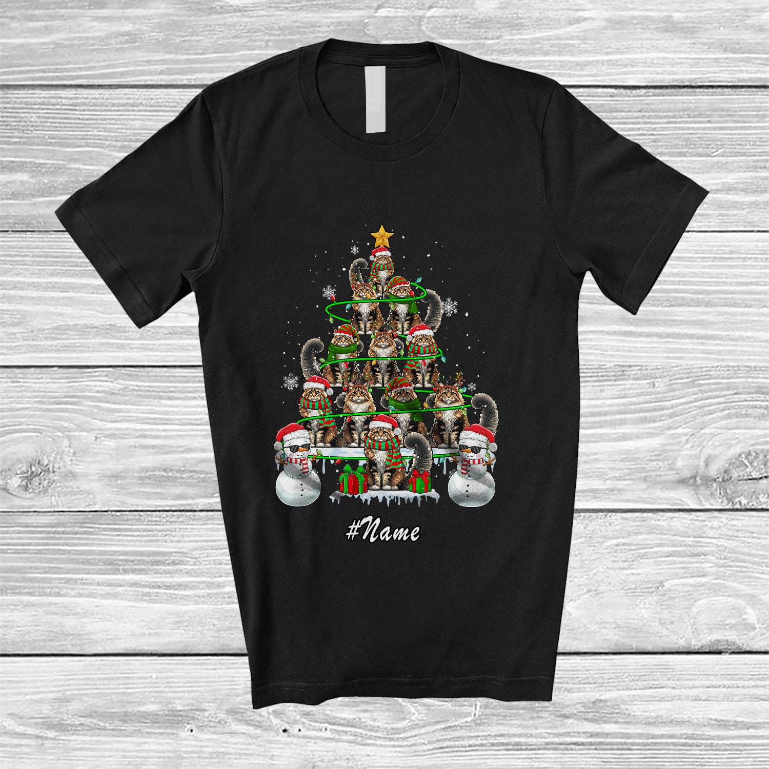 Personalized Custom Name Maine Coon Christmas Tree Snowman; Lovely X-mas Lights Family T-Shirt. This cotton t-shirt is a durable staple product with a classic fit. One of the most popular items, it has a relaxed style made for everyday and casual wear.