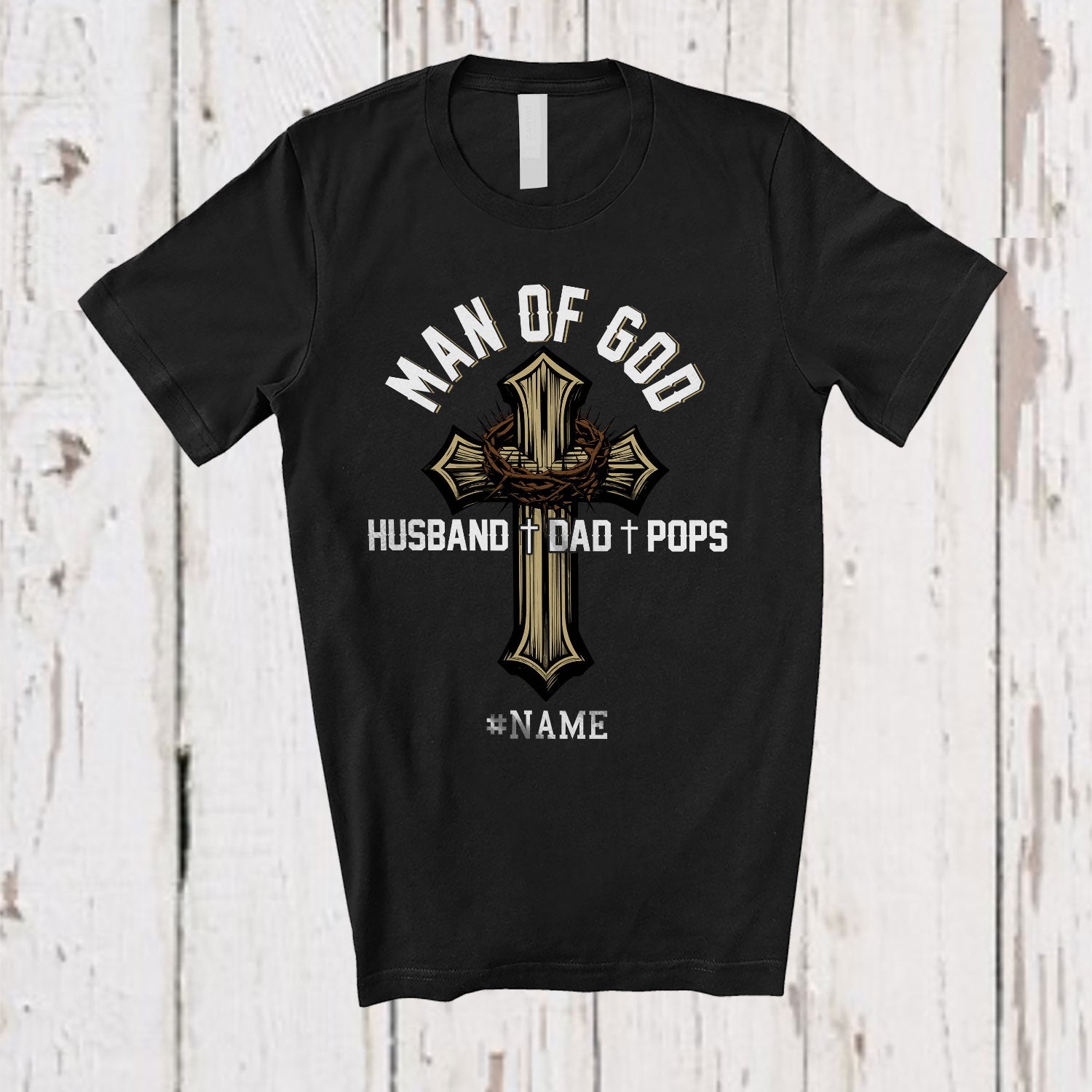 Personalized Custom Name Man Of God Husband Dad Pops; Amazing Father's Day Cross; Family T-Shirt. This cotton t-shirt is a durable staple product with a classic fit. One of the most popular items, it has a relaxed style made for everyday and casual wear.