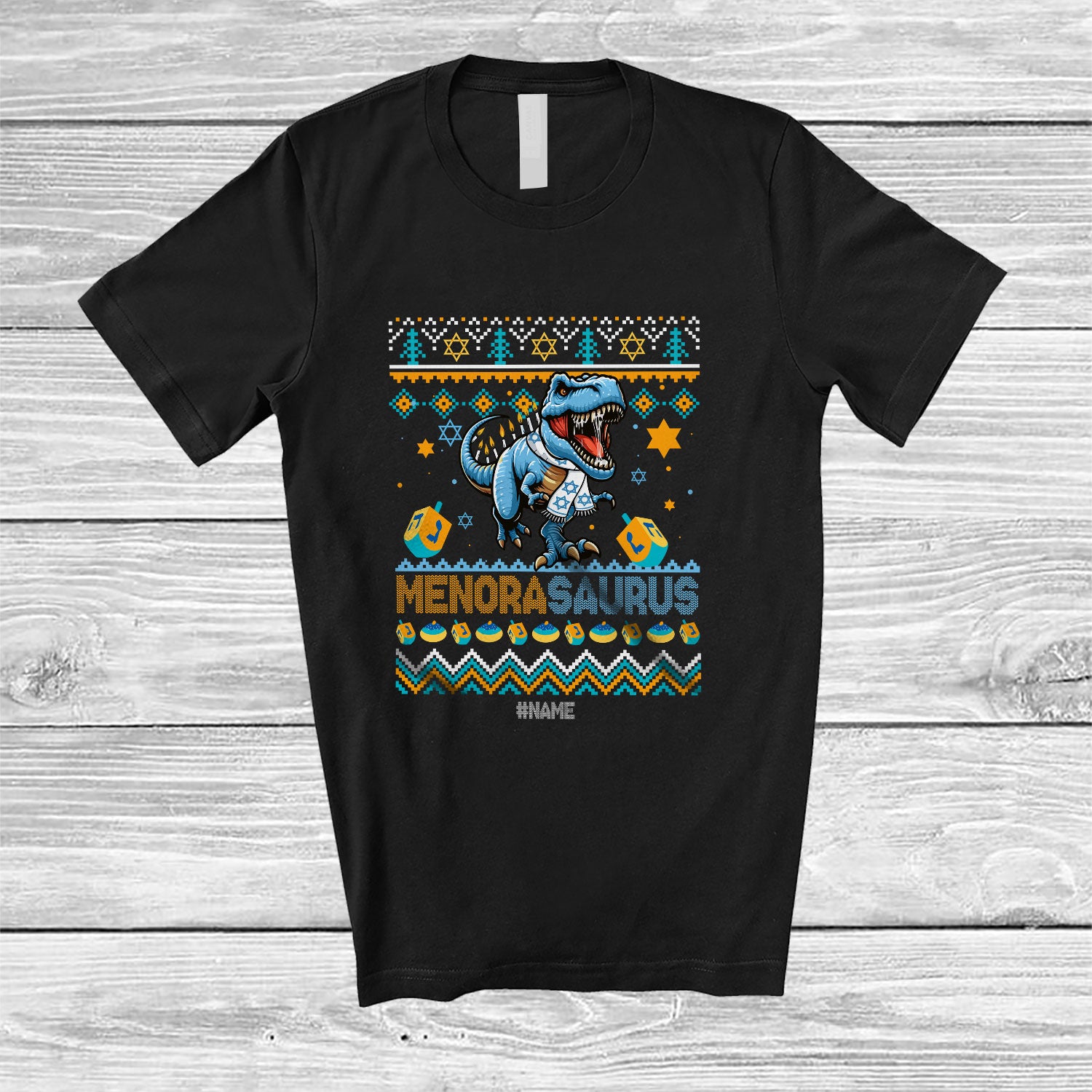 • Personalized Custom Name Menorasaurus; Amusing Hanukkah Sweater T-Rex Dinosaur T-Shirt. This cotton t-shirt is a durable staple product with a classic fit. One of the most popular items, it has a relaxed style made for everyday and casual wear.