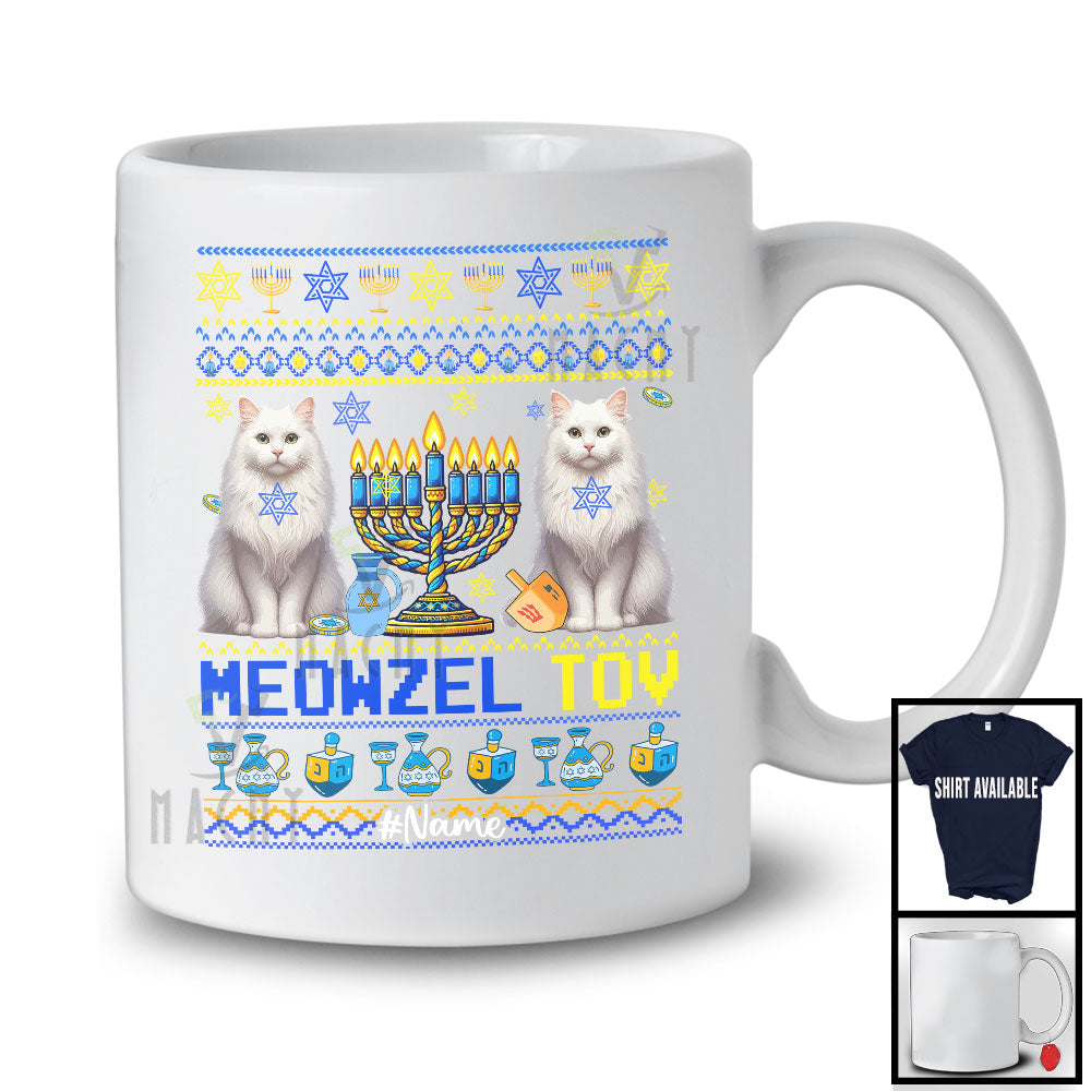 • Personalized Custom Name Meowzel Tov; Lovely Hanukkah Sweater Two Cat Menorah; Family T-Shirt. This cotton t-shirt is a durable staple product with a classic fit. One of the most popular items, it has a relaxed style made for everyday and casual wear.