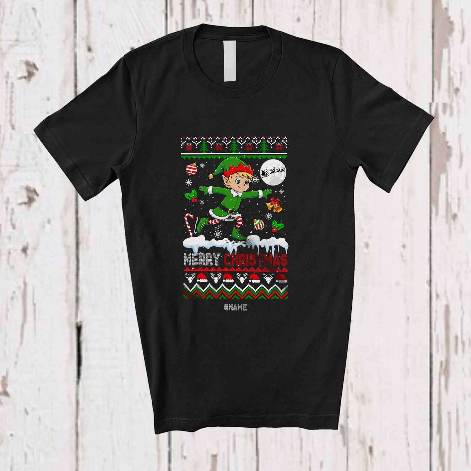 Personalized Custom Name Merry Christmas; Joyful Sweater Elf Ski Skating; Outdoor Sport T-Shirt. This cotton t-shirt is a durable staple product with a classic fit. One of the most popular items, it has a relaxed style made for everyday and casual wear.