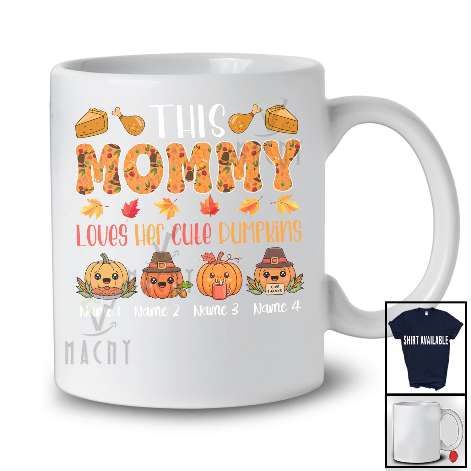 Personalized Custom Name Mommy Loves Her Cute Pumpkins; Lovely Thanksgiving Fall Leaf Family T-Shirt. This cotton t-shirt is a durable staple product with a classic fit. One of the most popular items, it has a relaxed style made for everyday and casual wear.