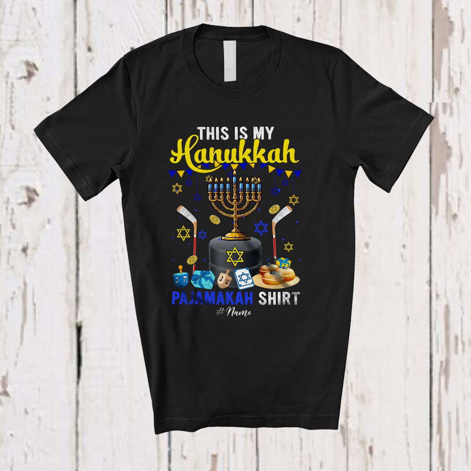 • Personalized Custom Name My Hanukkah Pajama Shirt; Joyful Custom Name Hockey Stick Player T-Shirt. This cotton t-shirt is a durable staple product with a classic fit. One of the most popular items, it has a relaxed style made for everyday and casual wear.