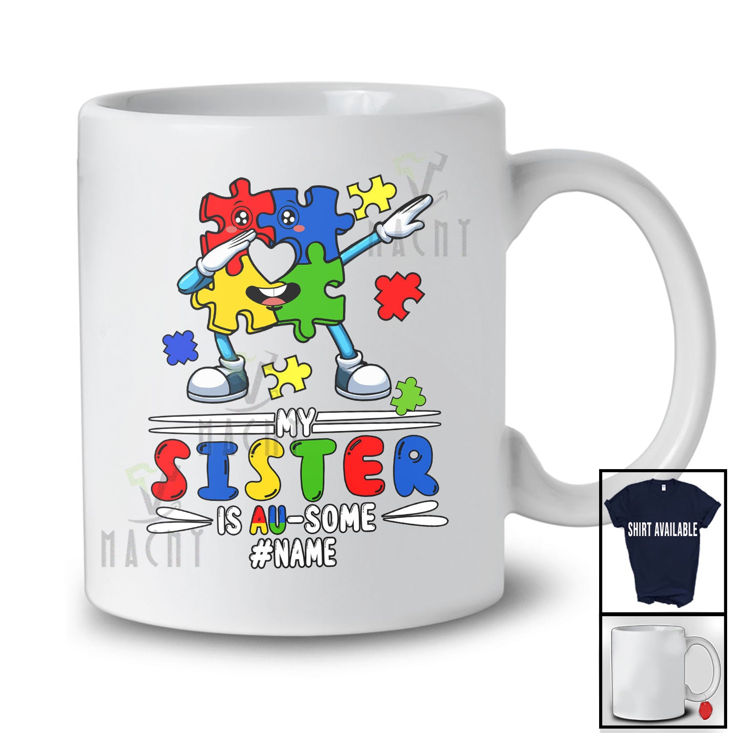 Personalized Custom Name My Sister Is Au-some; Joyful Autism Awareness Puzzle Dabbing T-Shirt. This cotton t-shirt is a durable staple product with a classic fit. One of the most popular items, it has a relaxed style made for everyday and casual wear.