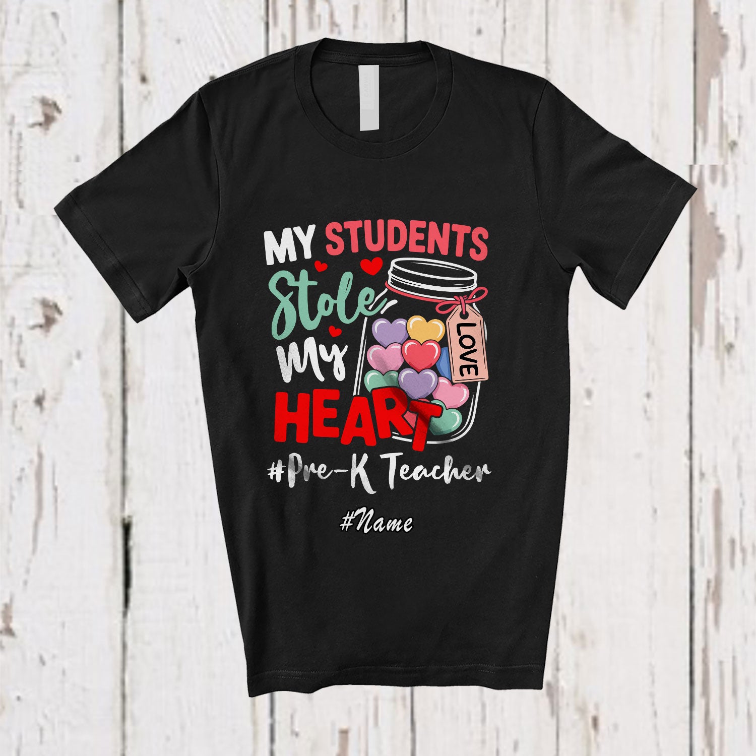 • Personalized Custom Name My Student Stole My Heart; Awesome Valentine Hearts Pre-K Teacher T-Shirt. This cotton t-shirt is a durable staple product with a classic fit. One of the most popular items, it has a relaxed style made for everyday and casual wear.