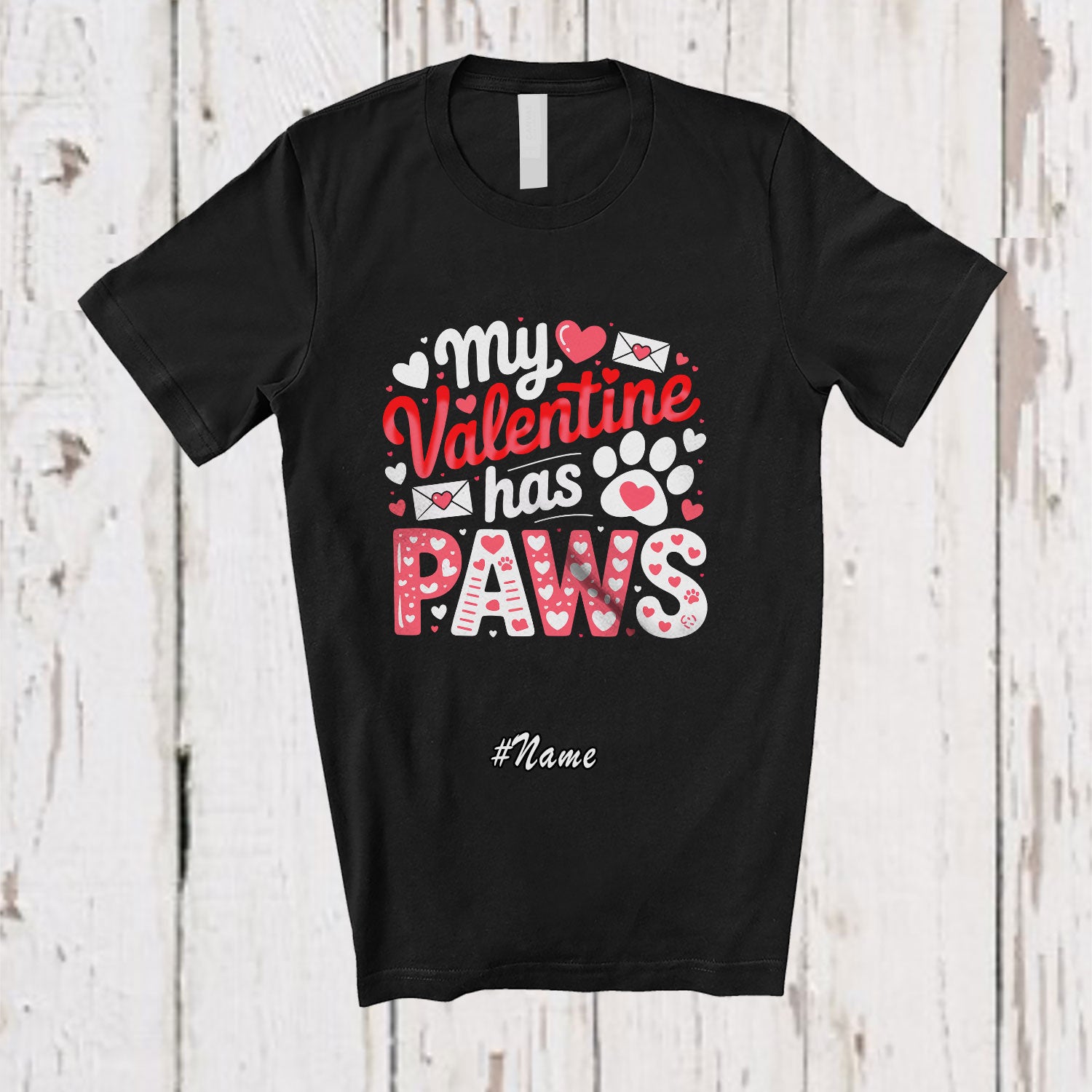 • Personalized Custom Name My Valentine Has Paws; Lovely Valentine's Day Hearts Dog Cat Owner Lover T-Shirt. This cotton t-shirt is a durable staple product with a classic fit. One of the most popular items, it has a relaxed style made for everyday and casual wear.