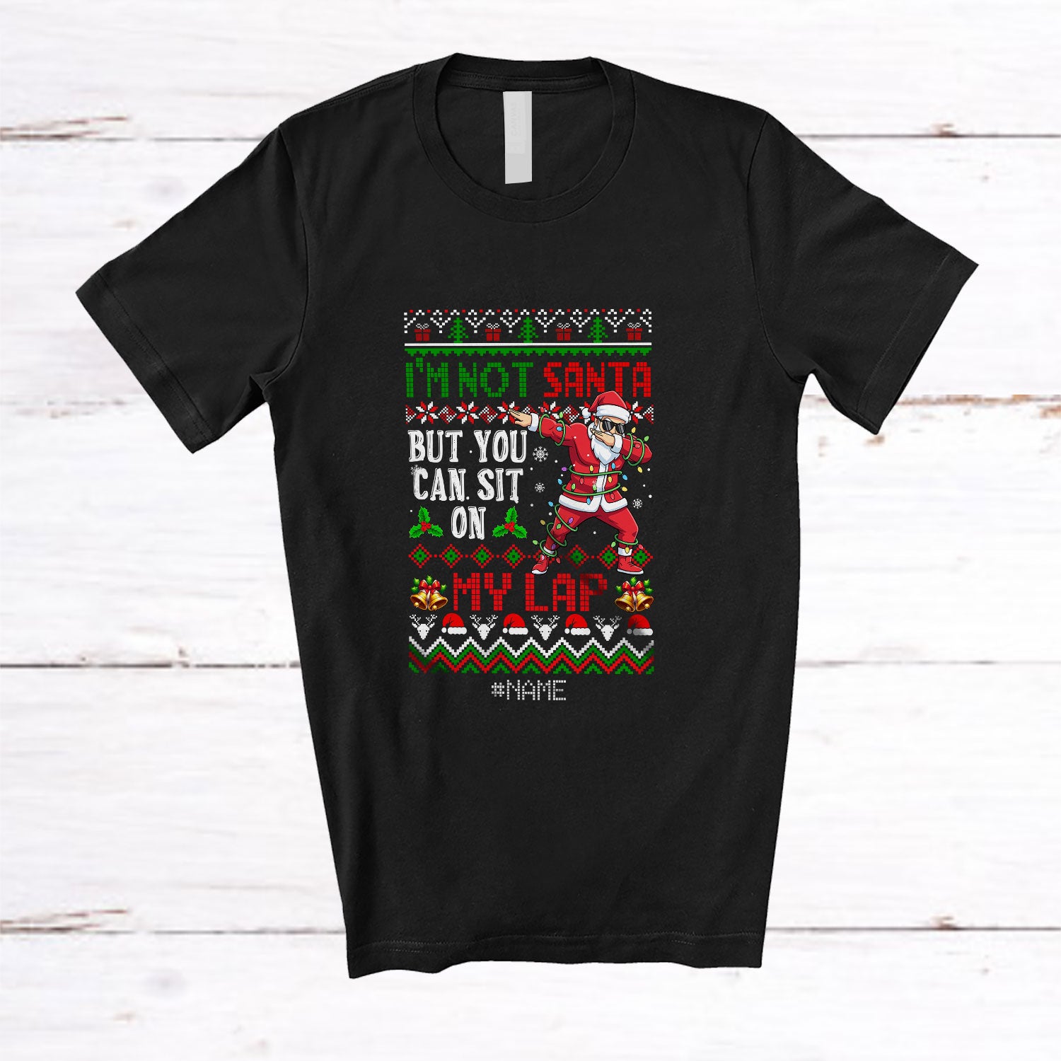 Personalized Custom Name Not Santa But You Can Sit On My Lap; Joyful Christmas Sweater Dabbing Santa T-Shirt. This cotton t-shirt is a durable staple product with a classic fit. One of the most popular items, it has a relaxed style made for everyday and casual wear.