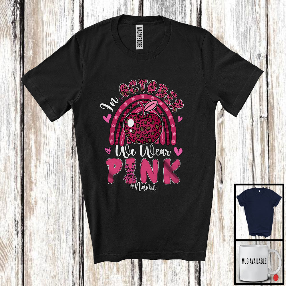 Personalized Custom Name October We Wear Pink; Lovely Breast Cancer Ribbon; Teacher Rainbow T-Shirt. This cotton t-shirt is a durable staple product with a classic fit. One of the most popular items, it has a relaxed style made for everyday and casual wear.