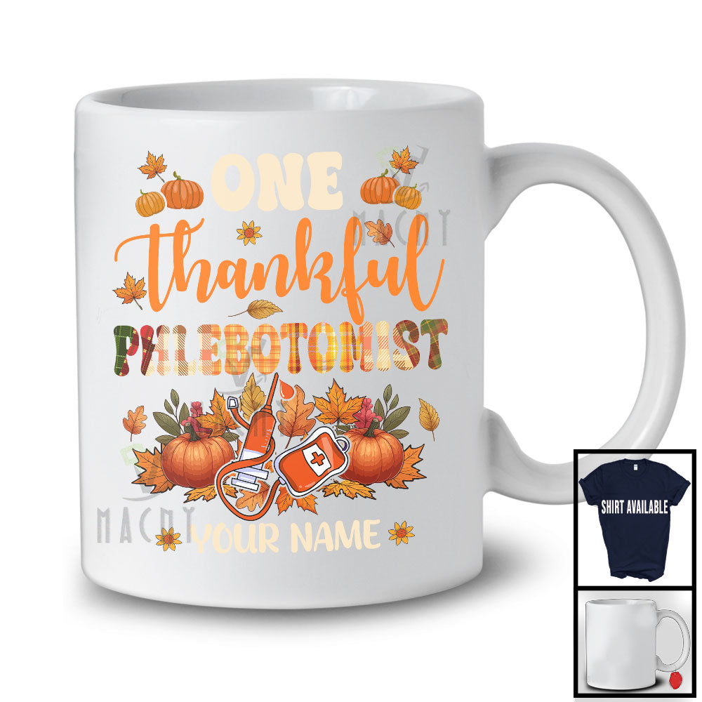 Personalized Custom Name One Thankful Phlebotomist; Happy Thanksgiving Plaid Pumpkins; Jobs T-Shirt. This cotton t-shirt is a durable staple product with a classic fit. One of the most popular items, it has a relaxed style made for everyday and casual wear.