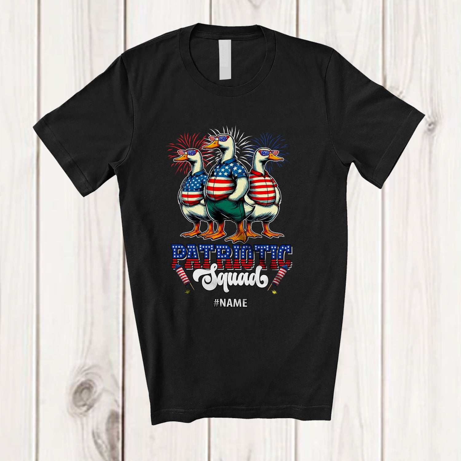 Personalized Custom Name Patriotic Squad; Lovely 4th Of July Three US Flag Duck; Farm Farmer T-Shirt. This cotton t-shirt is a durable staple product with a classic fit. One of the most popular items, it has a relaxed style made for everyday and casual wear.