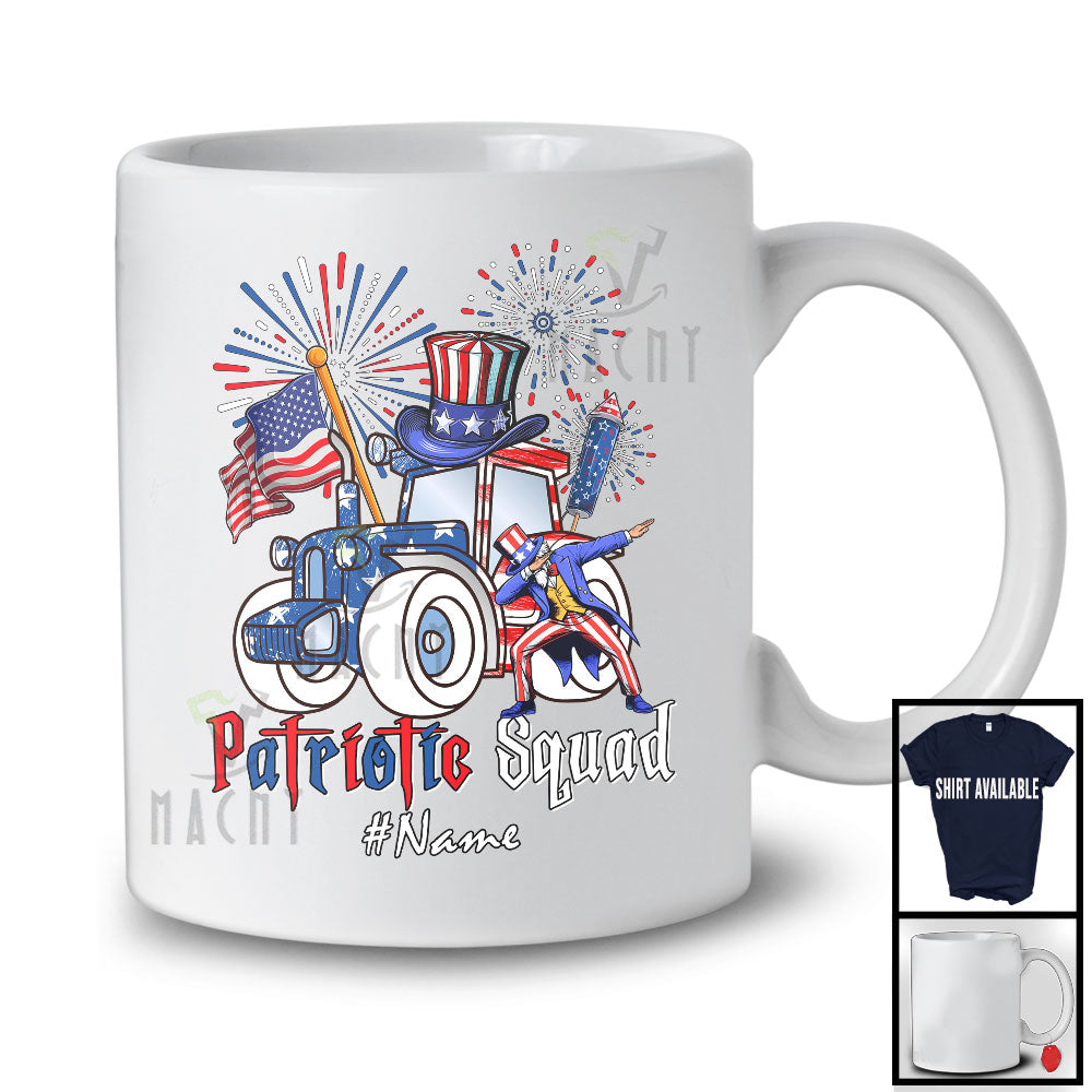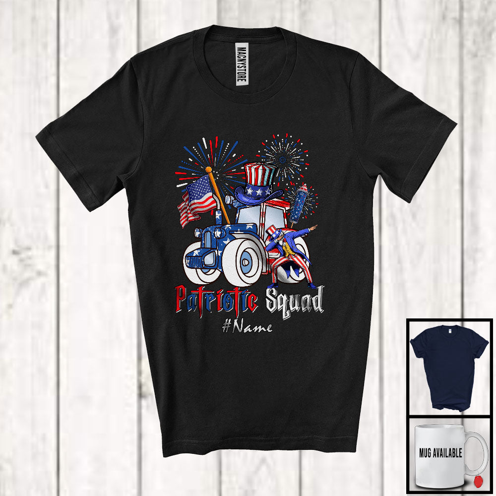 Personalized Custom Name Patriotic Squad, Proud 4th Of July Tractor Construction, Firecrackers T-Shirt. This cotton t-shirt is a durable staple product with a classic fit. One of the most popular items, it has a relaxed style made for everyday and casual wear.