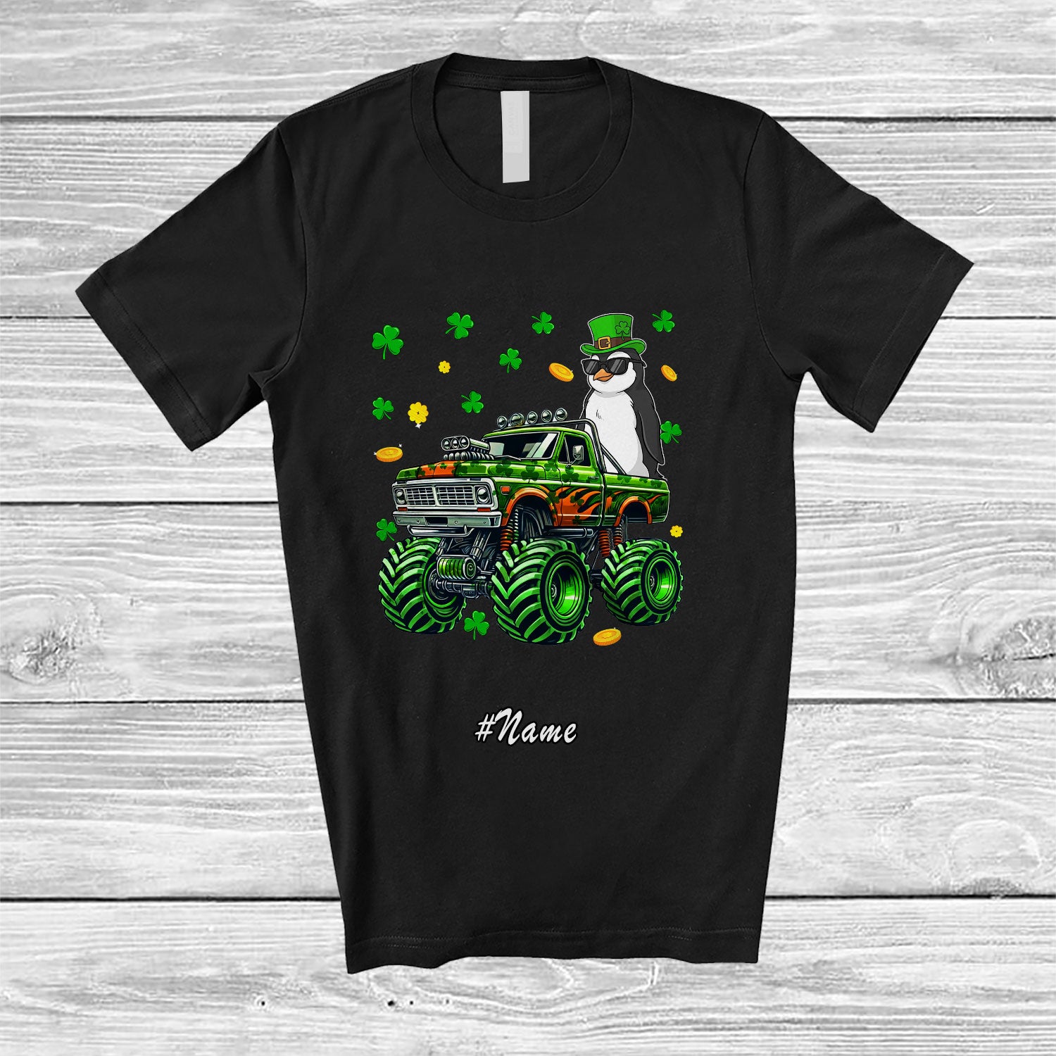 Personalized Custom Name Penguin On Monster Truck; Joyful St. Patrick's Day Shamrock Bird T-Shirt. This cotton t-shirt is a durable staple product with a classic fit. One of the most popular items, it has a relaxed style made for everyday and casual wear.