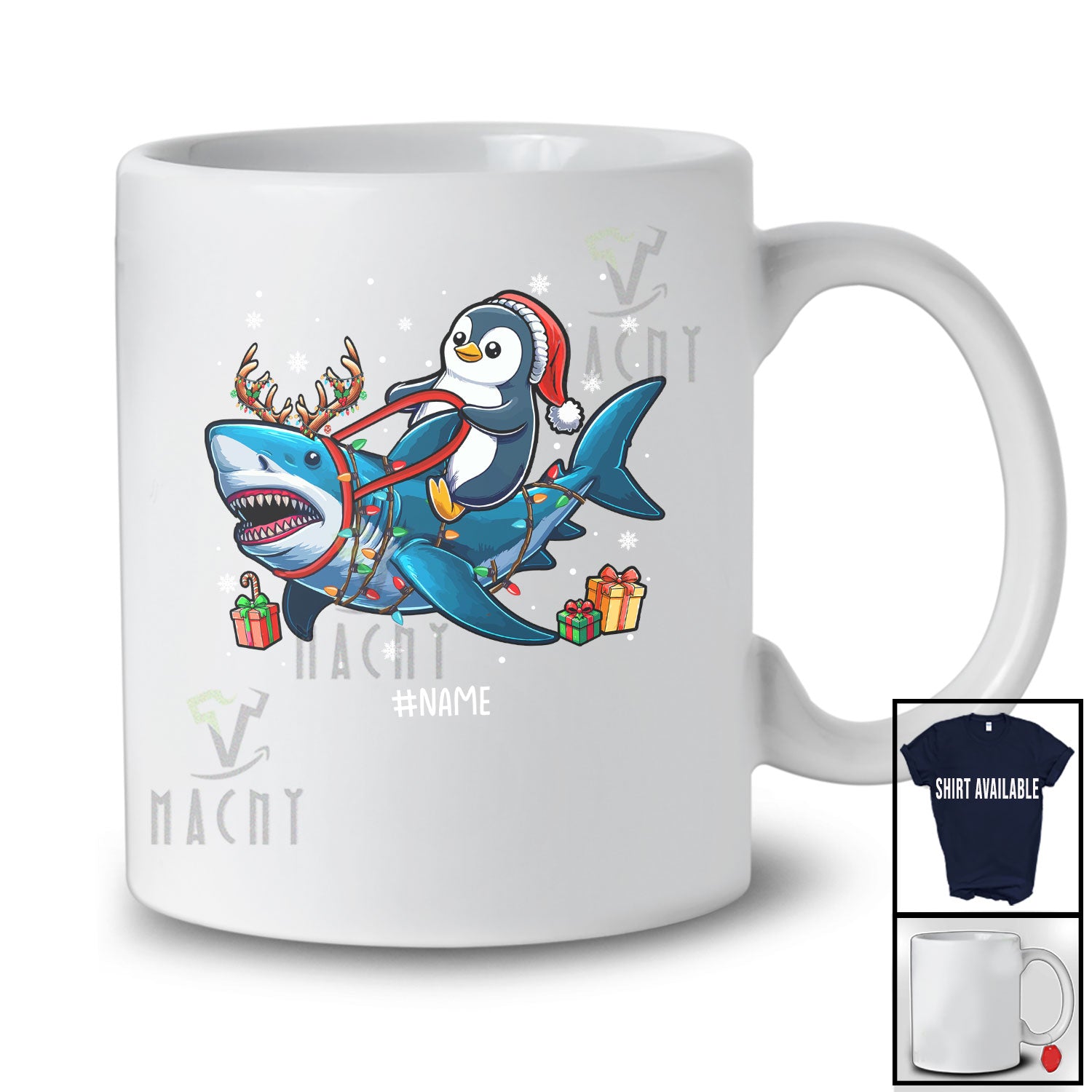 Personalized Custom Name Penguin Riding Reindeer Shark; Amusing Christmas Lights Sea Animal T-Shirt