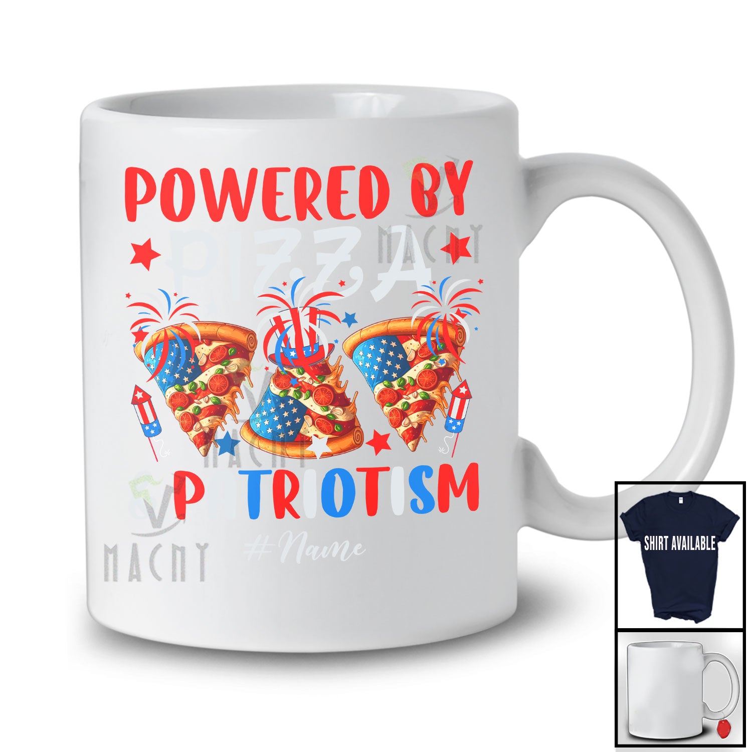 Personalized Custom Name Powered by Pizza And Patriotism; Lovely 4th Of July Patriotic T-Shirt. This cotton t-shirt is a durable staple product with a classic fit. One of the most popular items, it has a relaxed style made for everyday and casual wear.