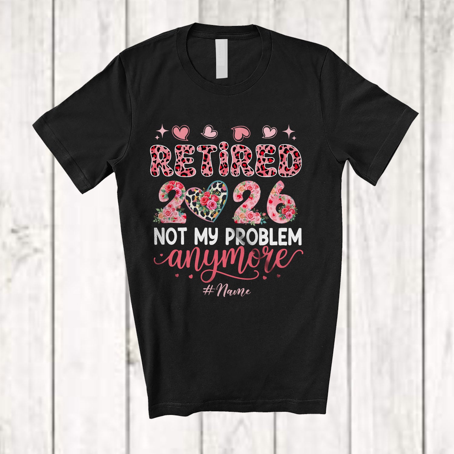 • Personalized Custom Name Retired 2026 Not My Problem; Lovely Retirement Floral Leopard Heart T-Shirt. This cotton t-shirt is a durable staple product with a classic fit. One of the most popular items, it has a relaxed style made for everyday and casual wear.