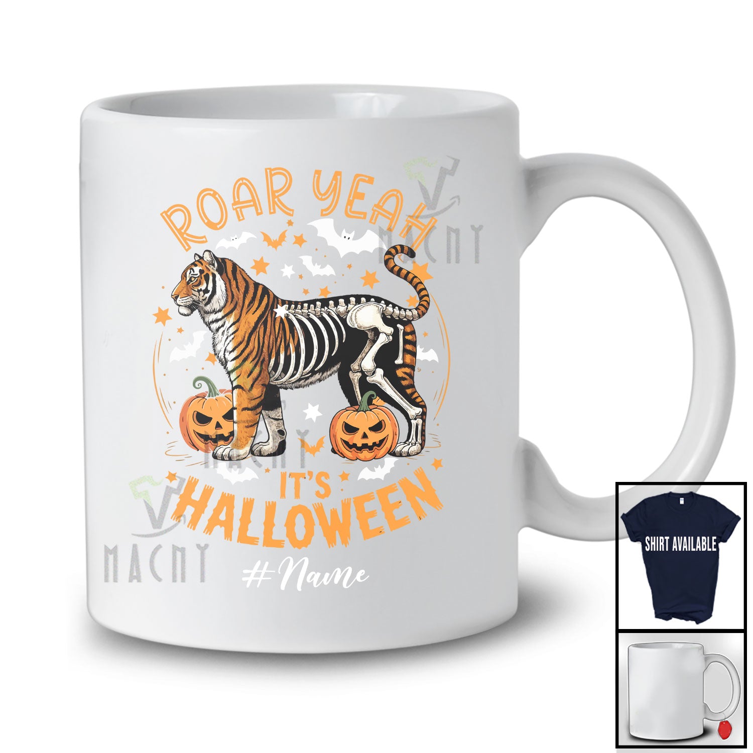 Personalized Custom Name Roar Yeah It's Halloween; Scary Skeleton Tiger Cosplay; Animal Lover T-Shirt. This cotton t-shirt is a durable staple product with a classic fit. One of the most popular items, it has a relaxed style made for everyday and casual wear.