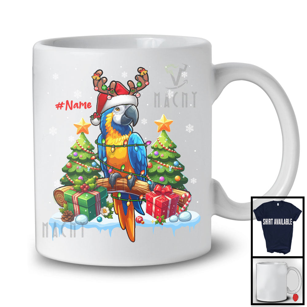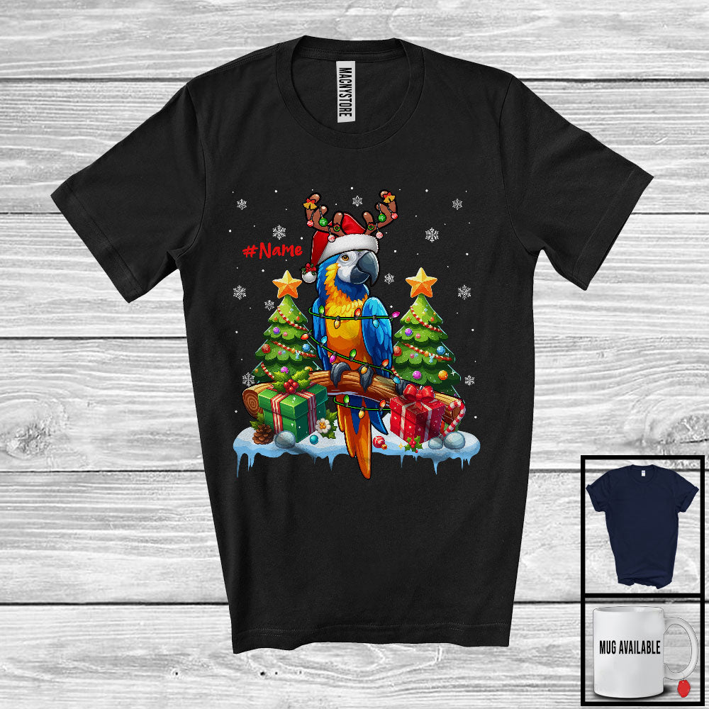 Personalized Custom Name Santa Reindeer Macaw; Joyful Christmas Tree Lights Macaw Bird T-Shirt