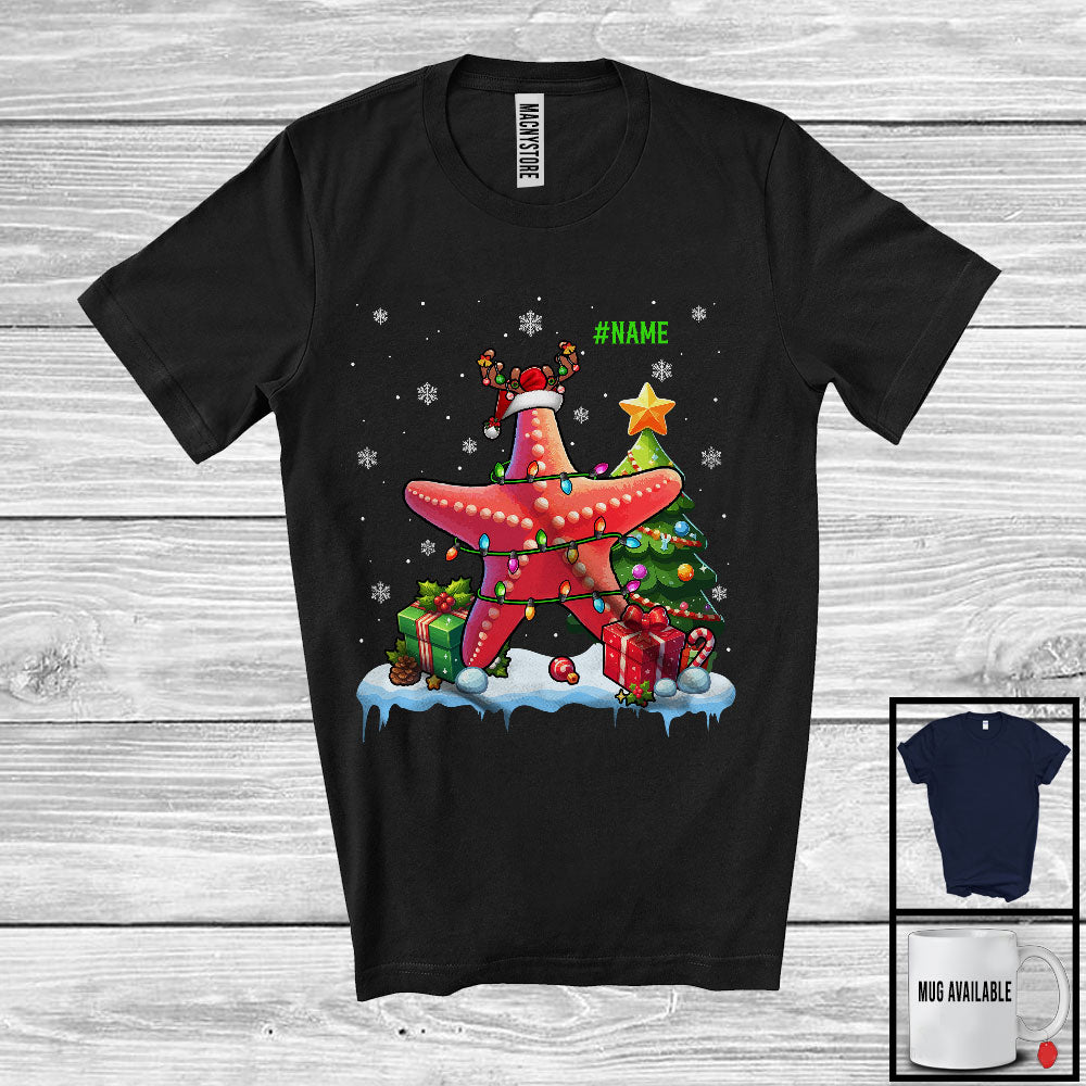 new MacnyStore - Personalized Custom Name Santa Reindeer Starfish; Joyful Christmas Tree Lights Starfish Animal T-Shirt – Macnystore