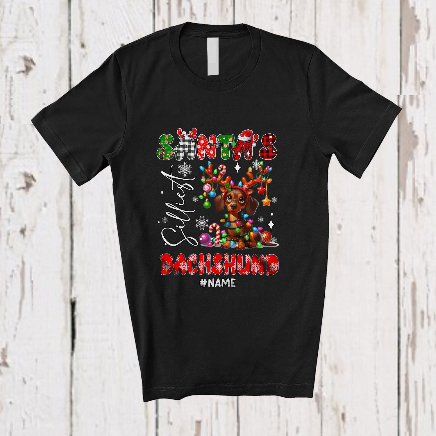 Personalized Custom Name Santa's Silliest Dachshund; Lovely Christmas Lights Plaid Animal Lover T-Shirt. This cotton t-shirt is a durable staple product with a classic fit. One of the most popular items, it has a relaxed style made for everyday and casual wear.