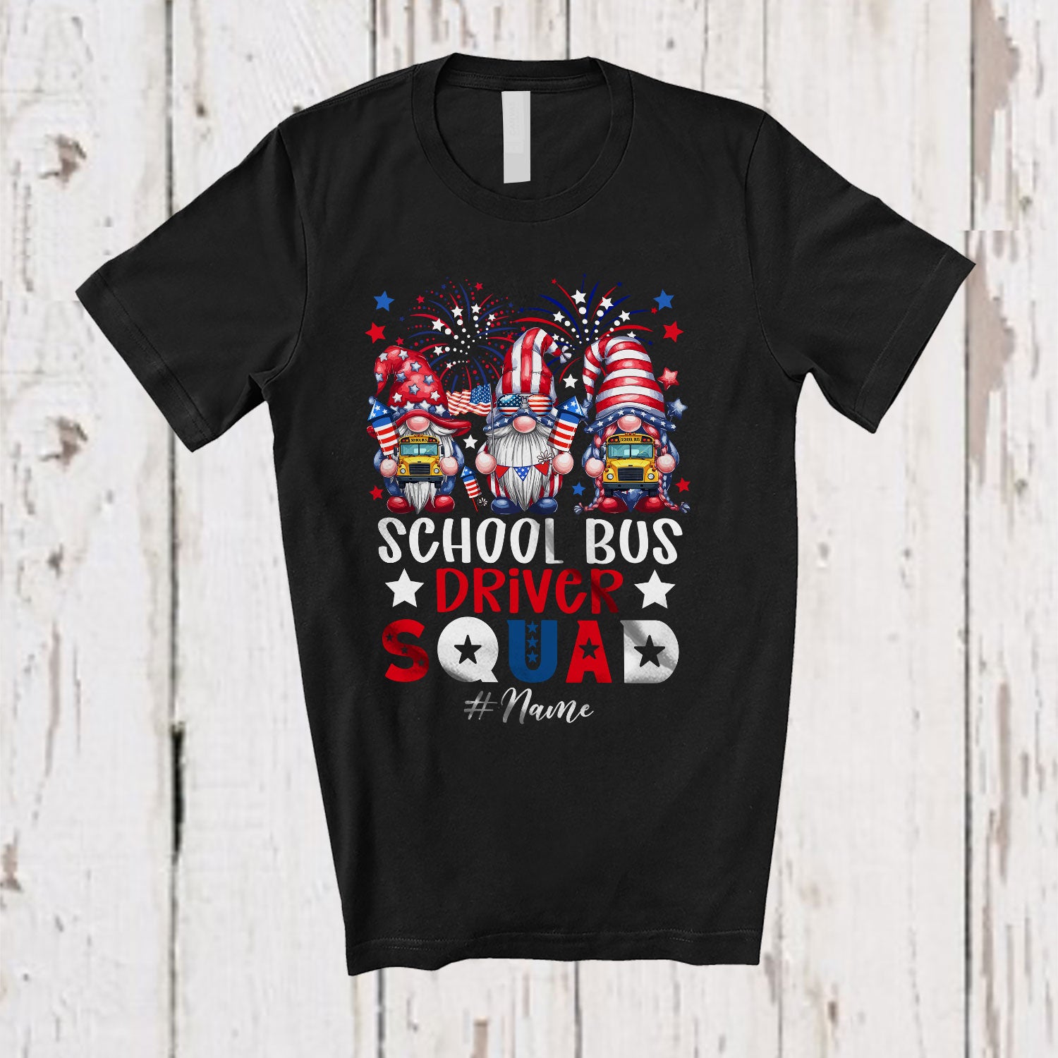 Personalized Custom Name School Bus Driver Squad; Adorable 4th Of July Three Patriotic Gnomes T-Shirt. This cotton t-shirt is a durable staple product with a classic fit. One of the most popular items, it has a relaxed style made for everyday and casual wear.