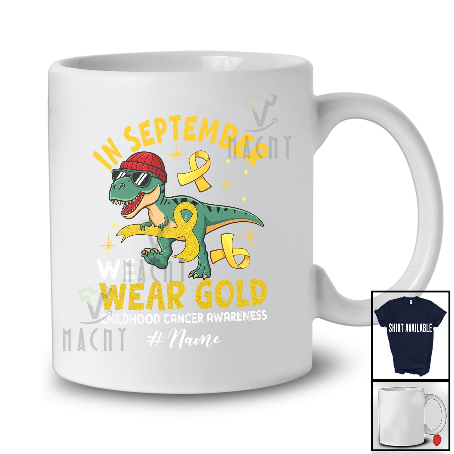 Personalized Custom Name September We Wear Gold; Lovely Childhood Cancer Ribbon T-Rex T-Shirt. This cotton t-shirt is a durable staple product with a classic fit. One of the most popular items, it has a relaxed style made for everyday and casual wear.