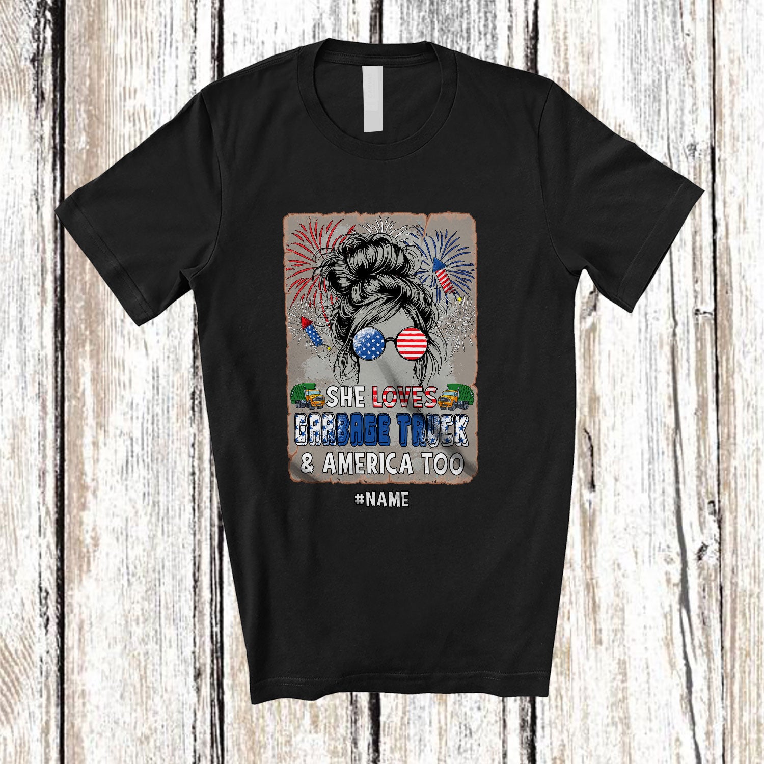 Personalized Custom Name She Loves Garbage Truck And America; Proud 4th Of July Messy Bun Hair T-Shirt