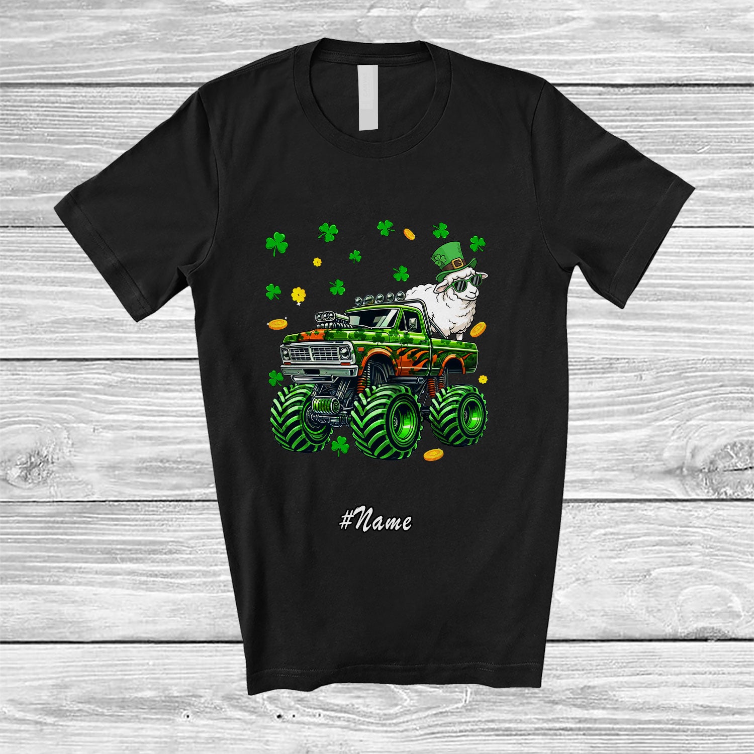 Personalized Custom Name Sheep On Monster Truck; Joyful St. Patrick's Day Shamrock Farm Animal T-Shirt. This cotton t-shirt is a durable staple product with a classic fit. One of the most popular items, it has a relaxed style made for everyday and casual wear.