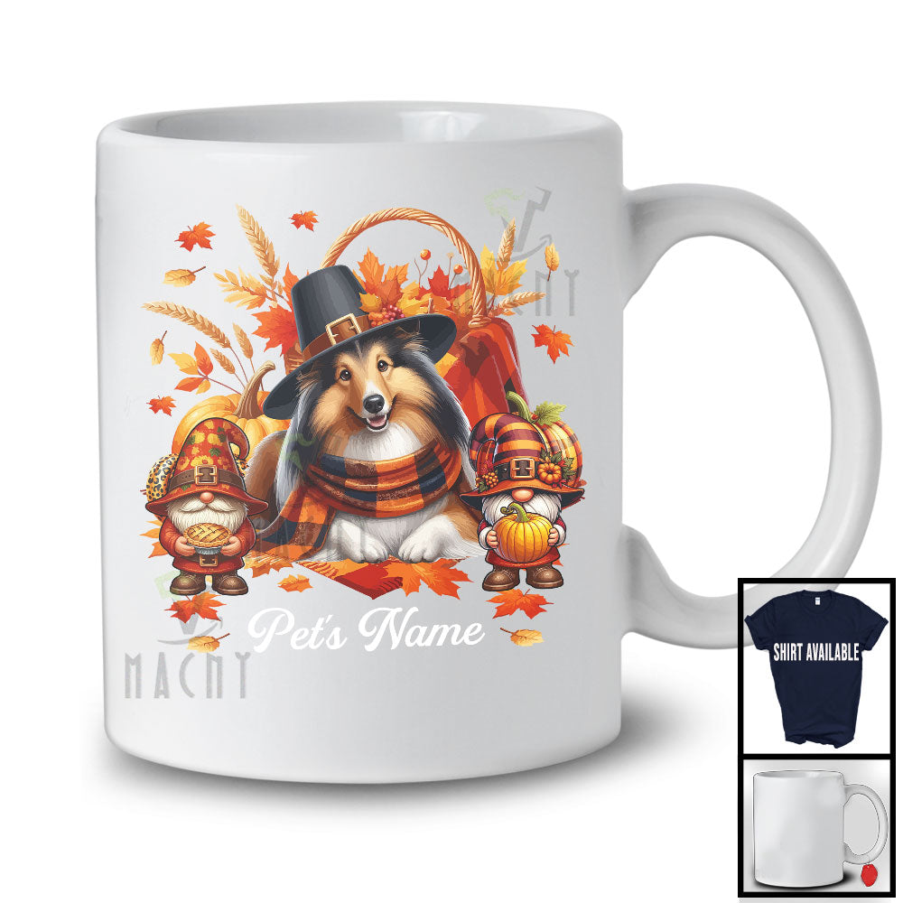 The Personalized Custom Name Sheltie Gnomes, Lovely Thanksgiving Fall Leaves, Pumpkins T-Shirt destined to impress, and priced at only $12.95, for a limited time.