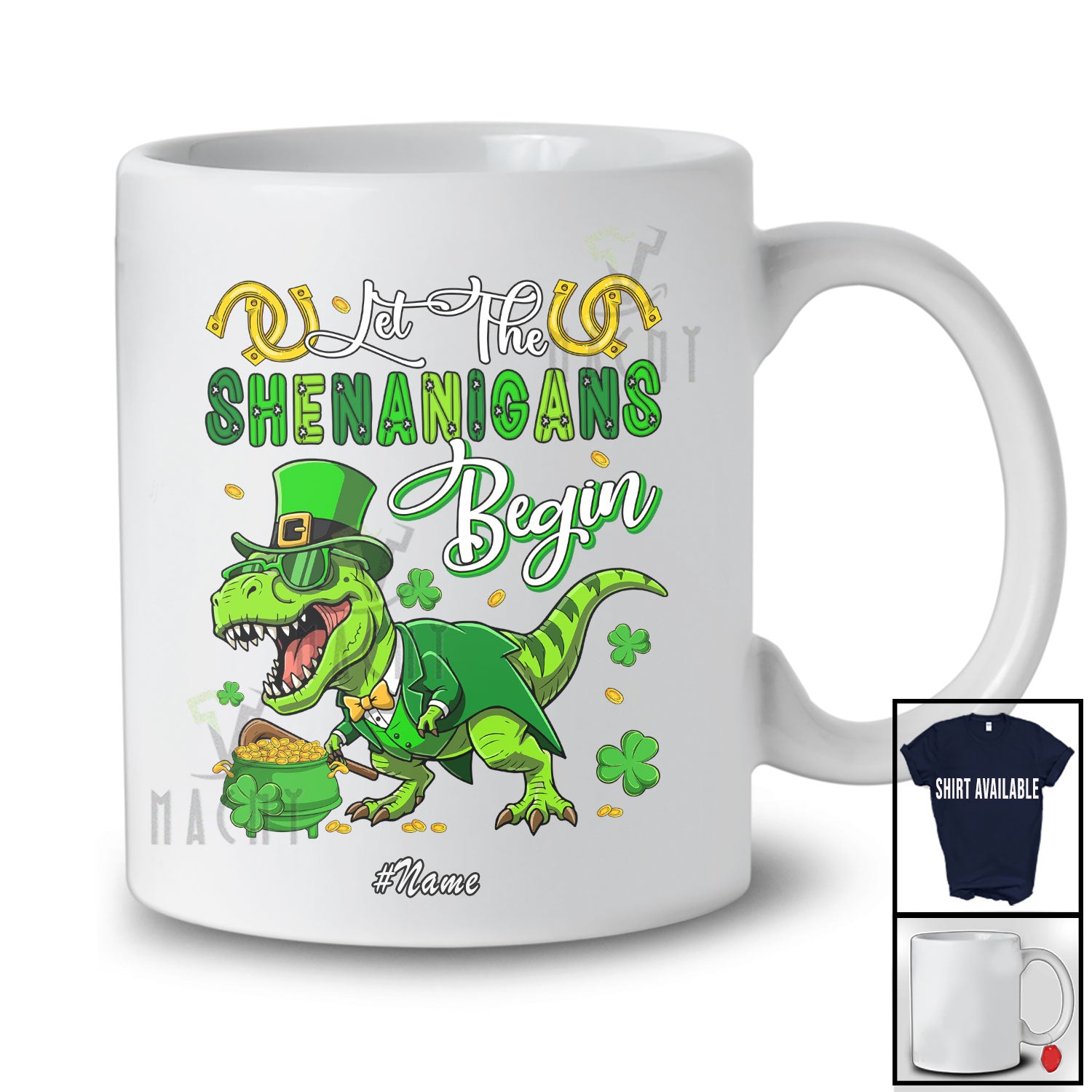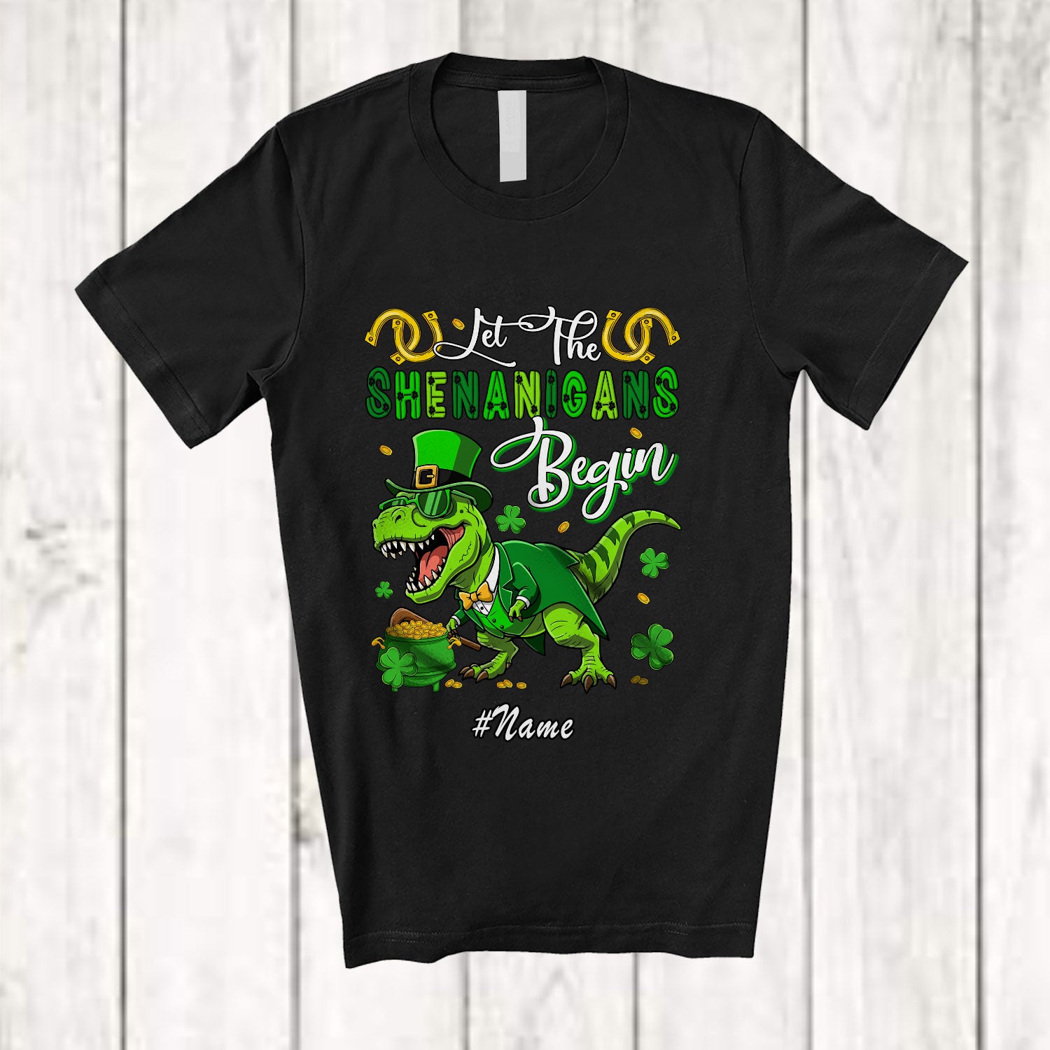 Personalized Custom Name Shenanigans Begin; Joyful St. Patrick's Day T-Rex Sunglasses Shamrock T-Shirt. This cotton t-shirt is a durable staple product with a classic fit. One of the most popular items, it has a relaxed style made for everyday and casual wear.