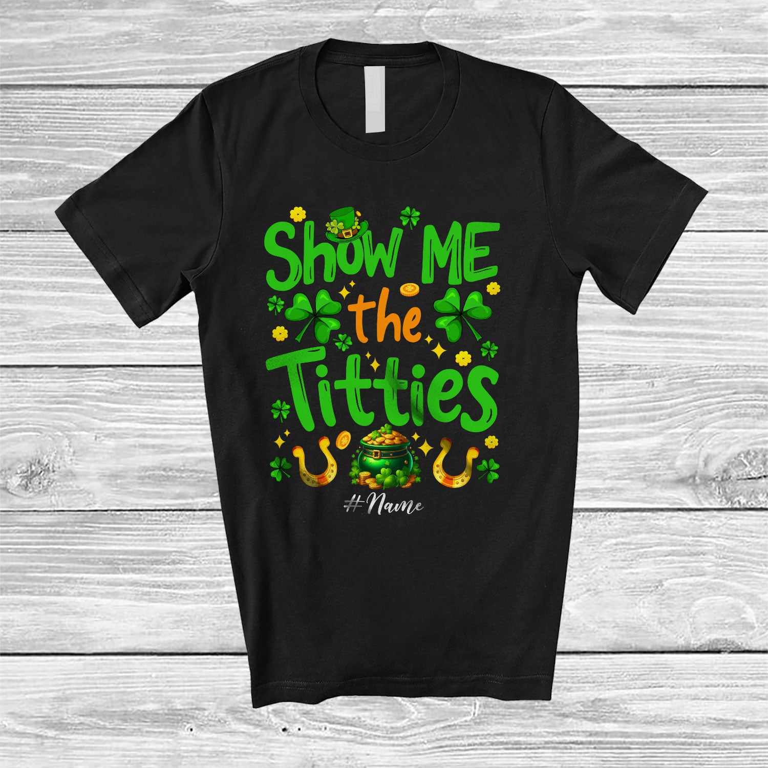 • Personalized Custom Name Show Me The Titties; Joyful St. Patrick's Day Gold Pot Shamrocks T-Shirt. This cotton t-shirt is a durable staple product with a classic fit. One of the most popular items, it has a relaxed style made for everyday and casual wear.