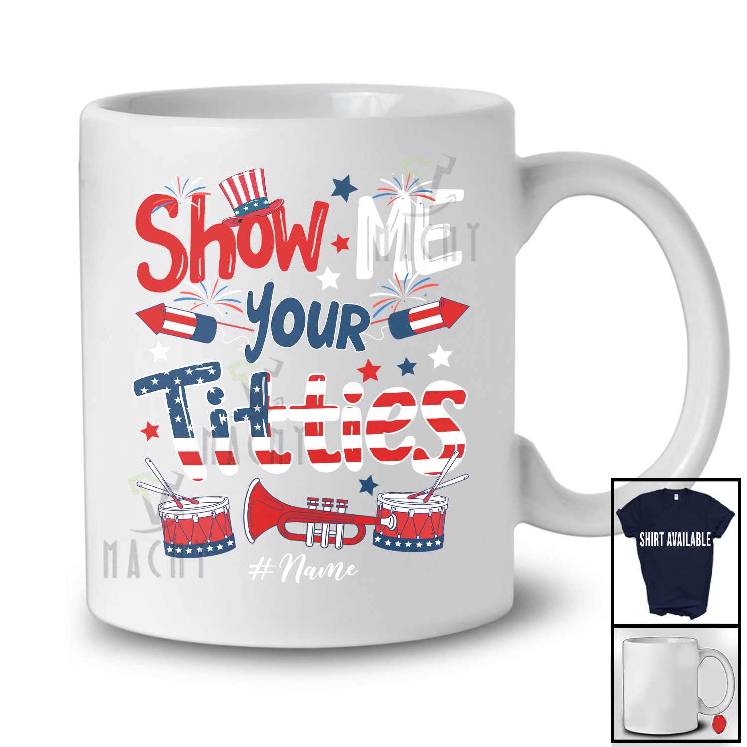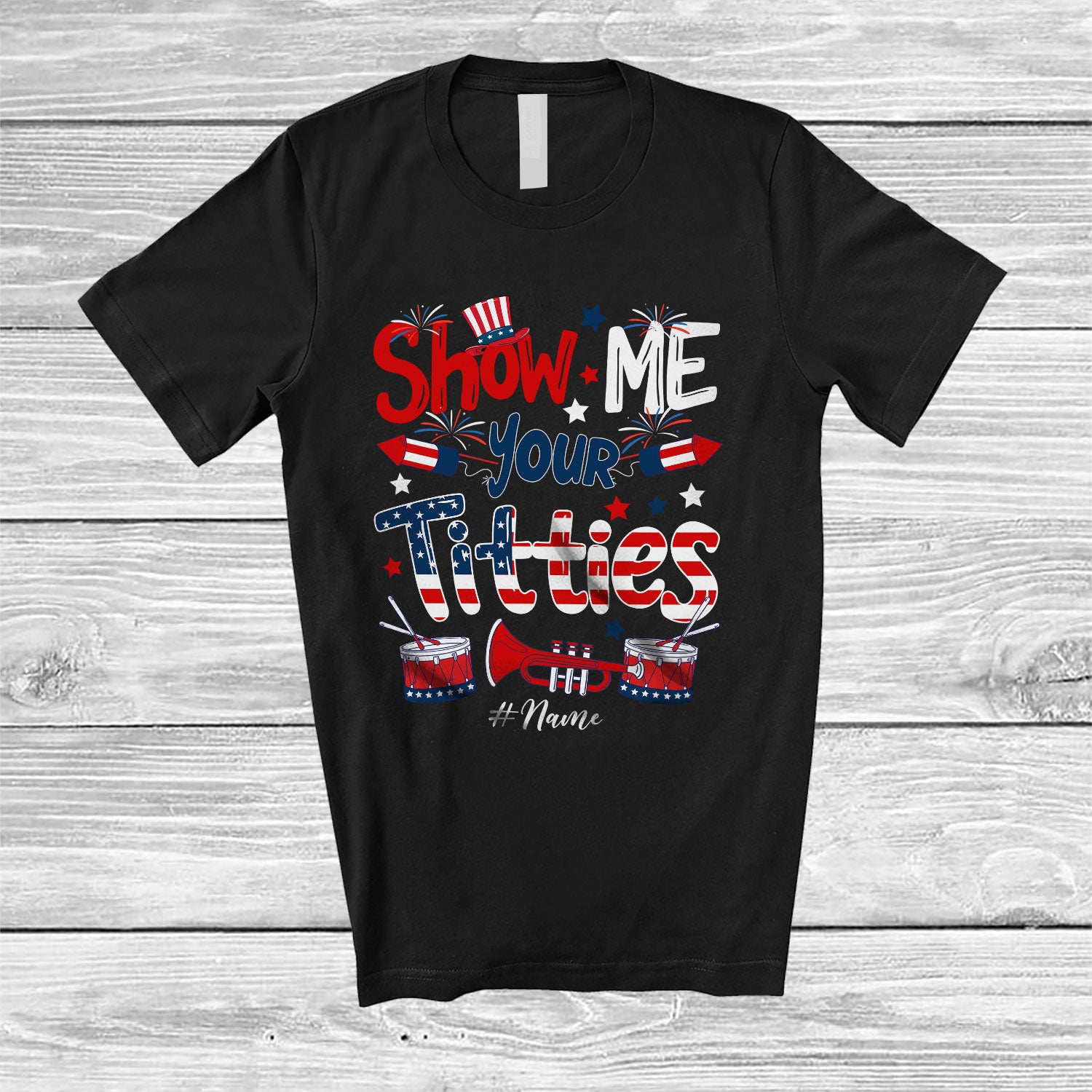 Personalized Custom Name Show Me Your Titties; Joyful 4th Of July American Flag Firecracker T-Shirt. This cotton t-shirt is a durable staple product with a classic fit. One of the most popular items, it has a relaxed style made for everyday and casual wear.