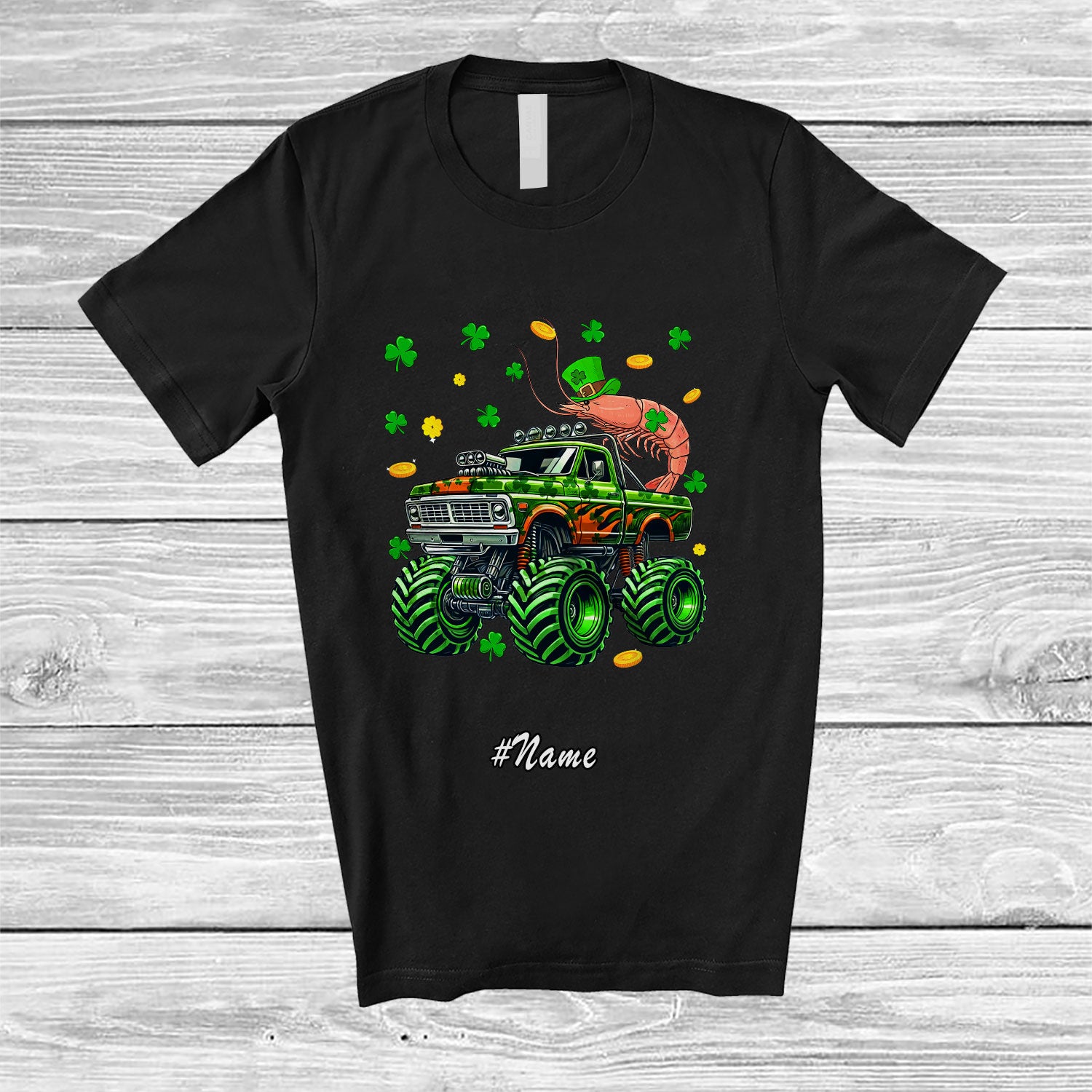 • Personalized Custom Name Shrimp On Monster Truck; Joyful St. Patrick's Day Shamrock Sea Animal T-Shirt. This cotton t-shirt is a durable staple product with a classic fit. One of the most popular items, it has a relaxed style made for everyday and casual wear.