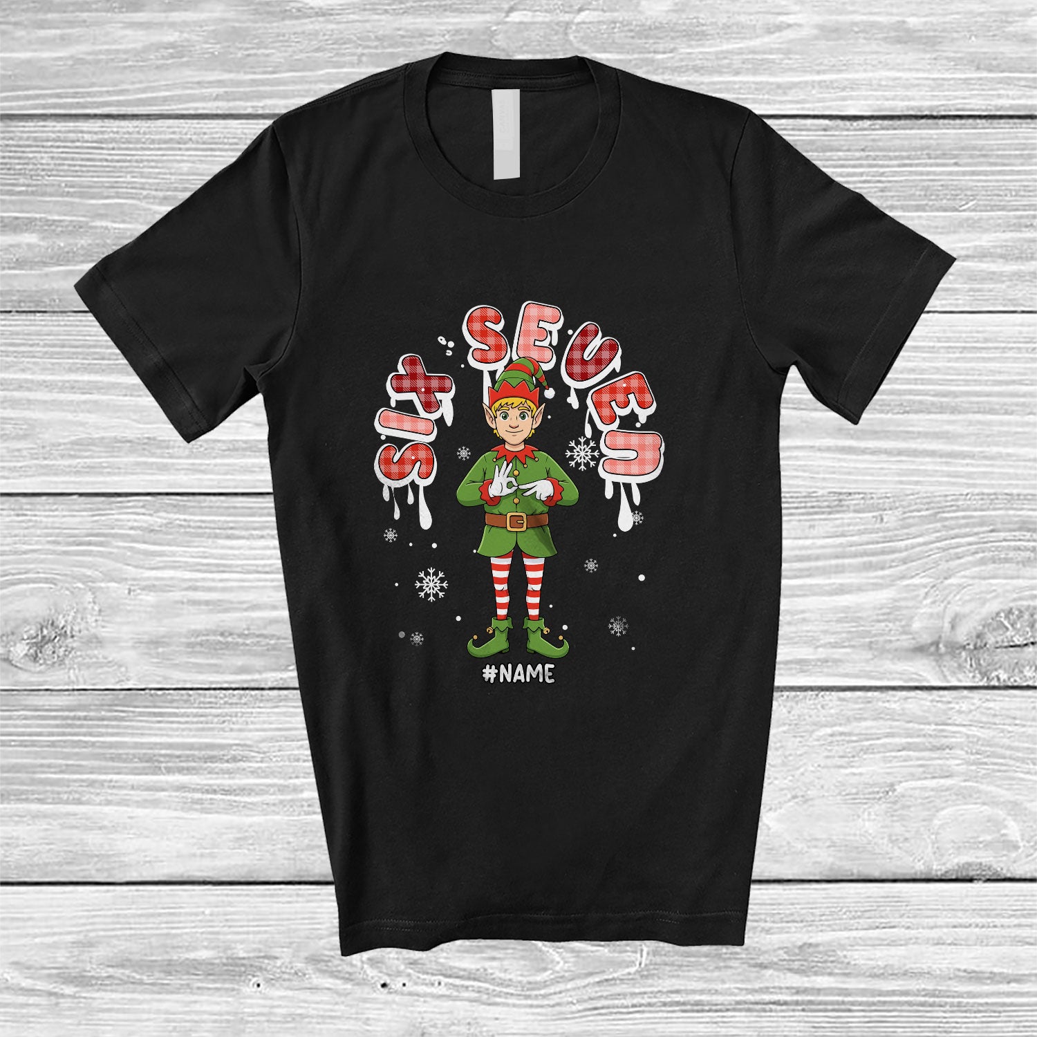 • Personalized Custom Name Six Seven; Amusing Christmas Plaid Elf; X-mas Family Group T-Shirt. This cotton t-shirt is a durable staple product with a classic fit. One of the most popular items, it has a relaxed style made for everyday and casual wear.
