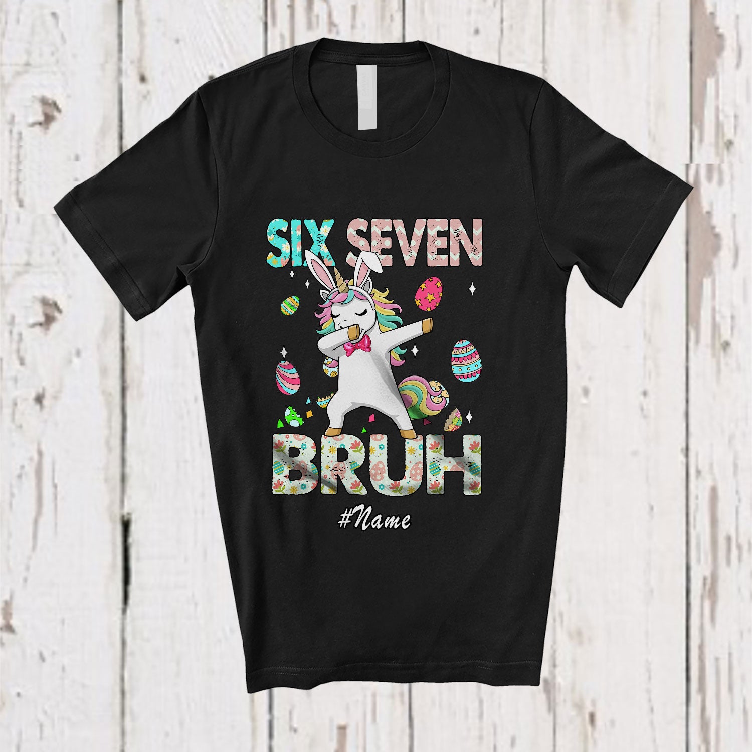Personalized Custom Name Six Seven Bruh; Adorable Easter Bunny Unicorn Dabbing 6 7; Eggs Hunting T-Shirt. This cotton t-shirt is a durable staple product with a classic fit. One of the most popular items, it has a relaxed style made for everyday and casual wear.