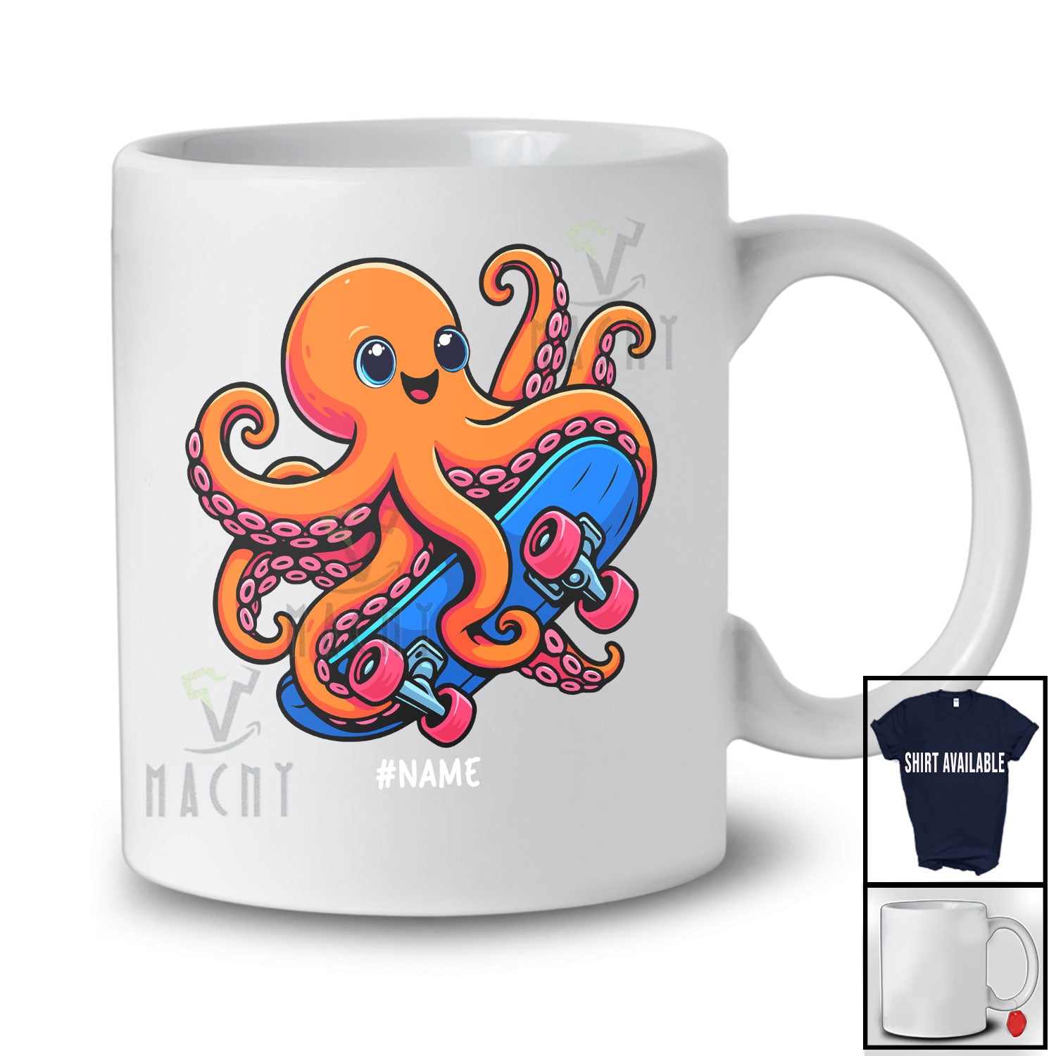Personalized Custom Name Skateboarding Octopus; Lovely Summer Vacation Octopus Sea Animal T-Shirt. This cotton t-shirt is a durable staple product with a classic fit. One of the most popular items, it has a relaxed style made for everyday and casual wear.