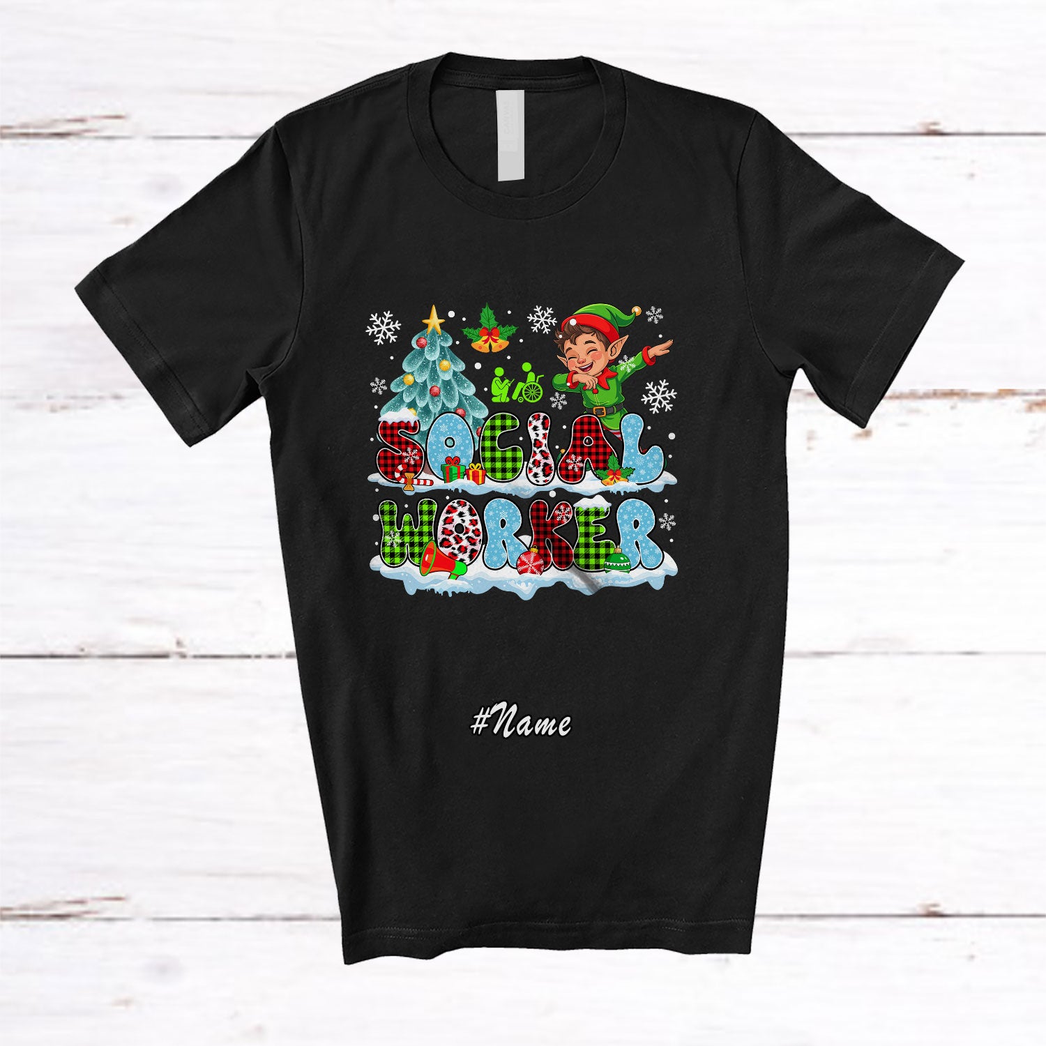 • Personalized Custom Name Social Worker; Cheerful Christmas Tree Snow Dabbing Elf; Proud Jobs T-Shirt. This cotton t-shirt is a durable staple product with a classic fit. One of the most popular items, it has a relaxed style made for everyday and casual wear.