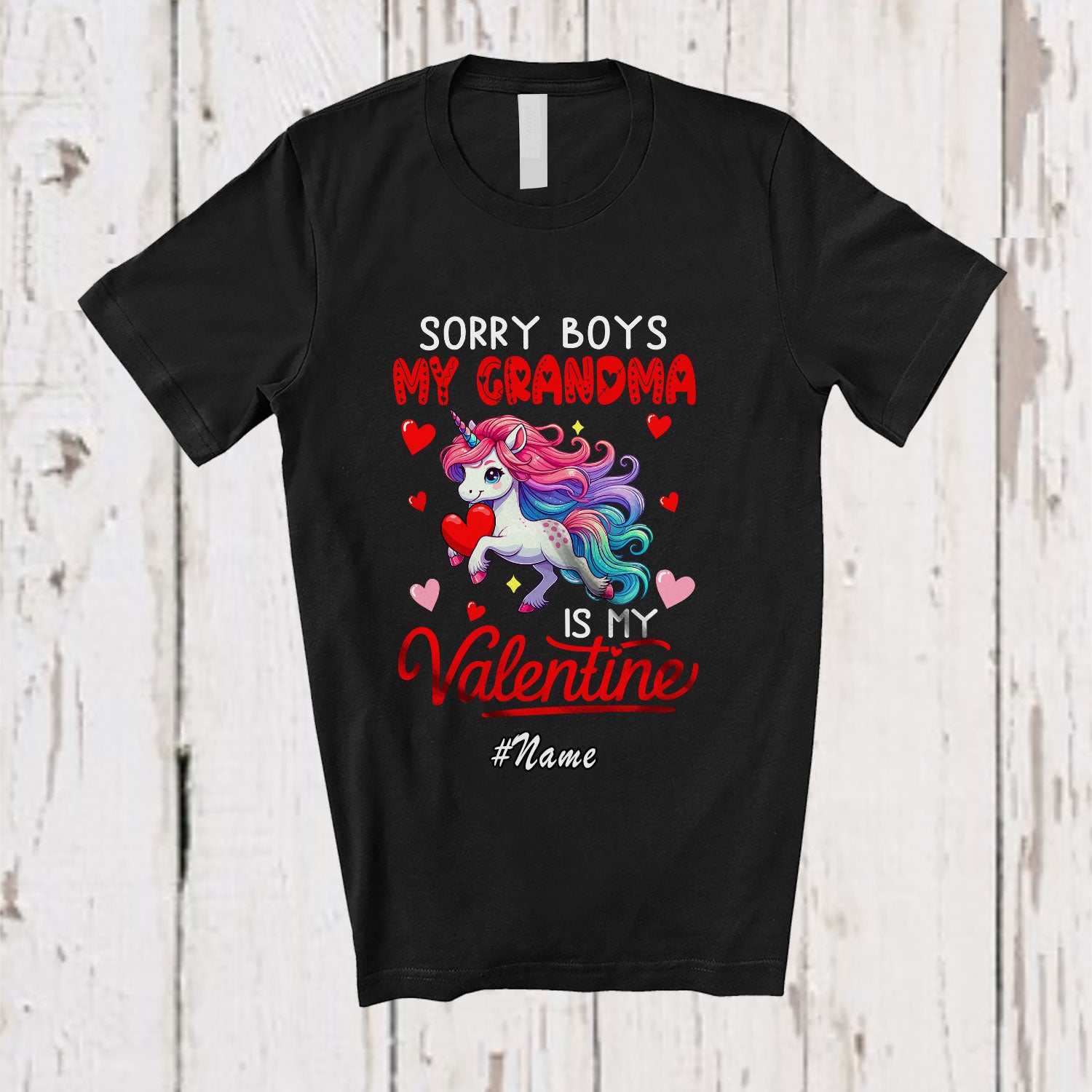 • Personalized Custom Name Sorry Grandma Is My Valentine; Lovely Family Girls Unicorn With Hearts T-Shirt. This cotton t-shirt is a durable staple product with a classic fit. One of the most popular items, it has a relaxed style made for everyday and casual wear.
