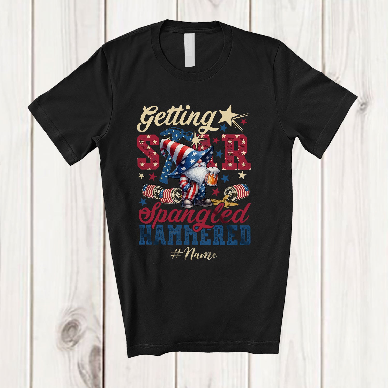 Personalized Custom Name Star Spangled Hammered; Joyful 4th Of July Gnome Drinking Patriotic T-Shirt