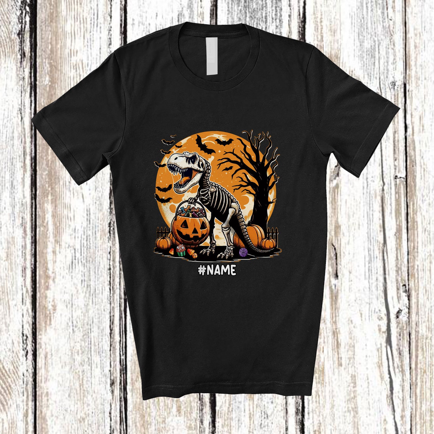 Personalized Custom Name T-Rex Skeleton Trick Candy; Scary Halloween Moon Dinosaur; Family T-Shirt. This cotton t-shirt is a durable staple product with a classic fit. One of the most popular items, it has a relaxed style made for everyday and casual wear.