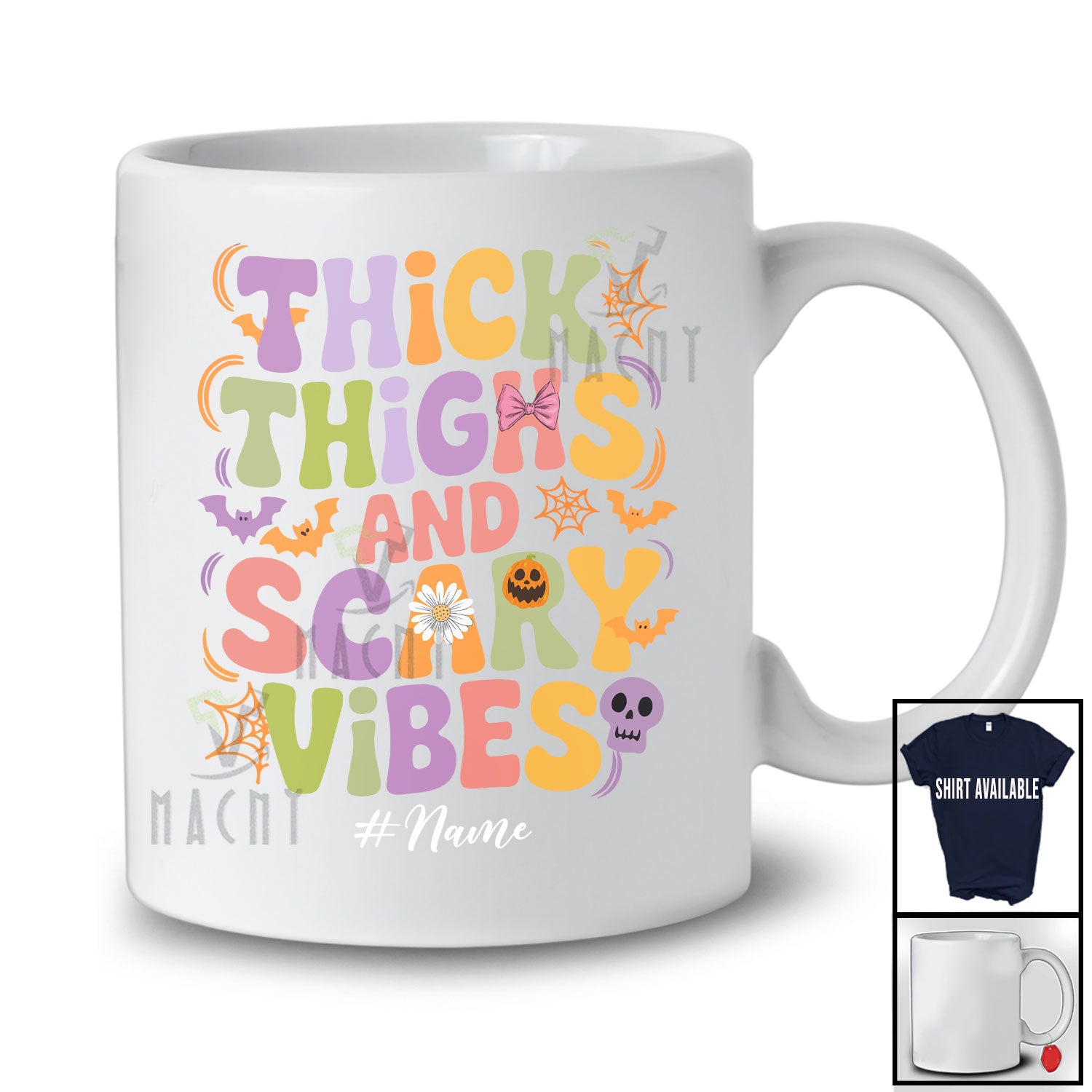 Personalized Custom Name Thick Thighs Scary Vibes; Joyful Halloween Bats Pumpkin; Groovy T-Shirt. This cotton t-shirt is a durable staple product with a classic fit. One of the most popular items, it has a relaxed style made for everyday and casual wear.