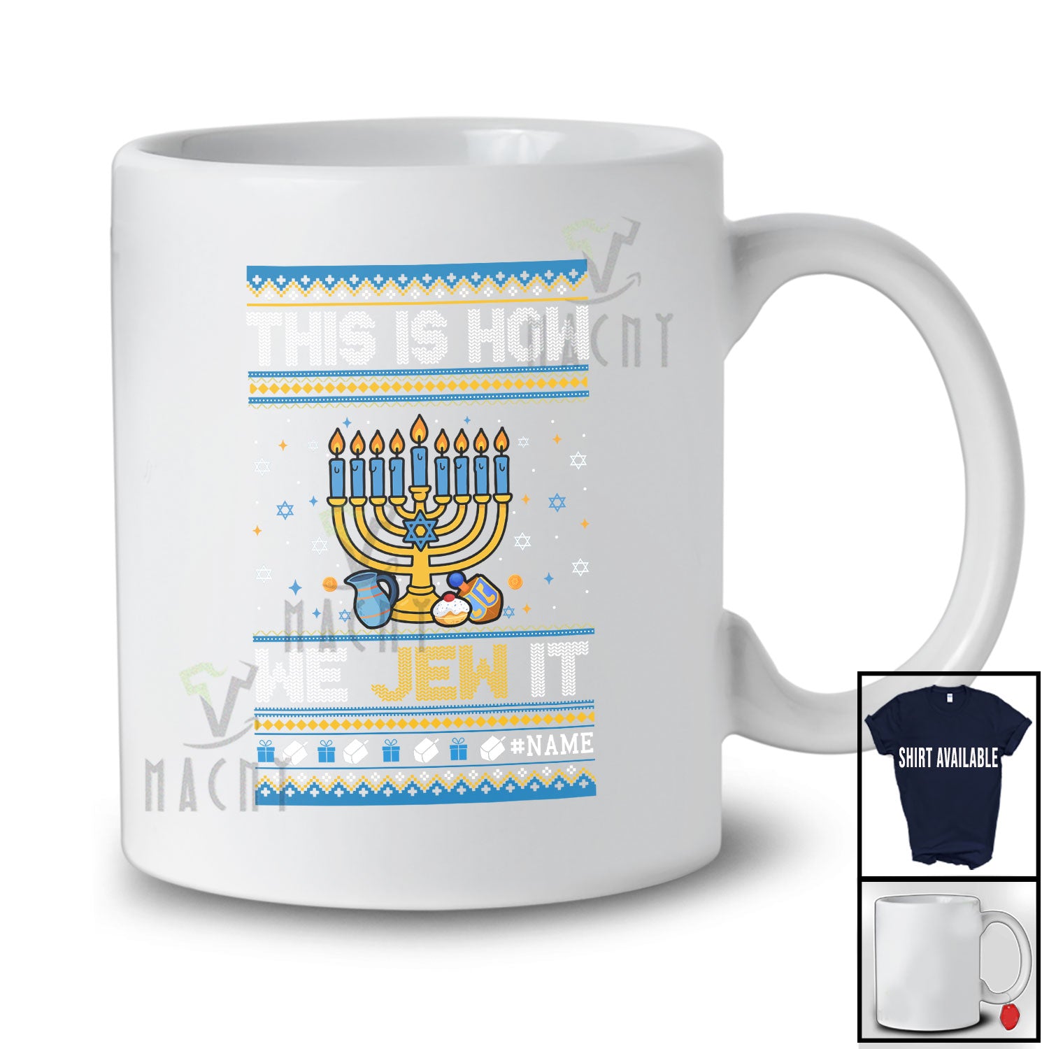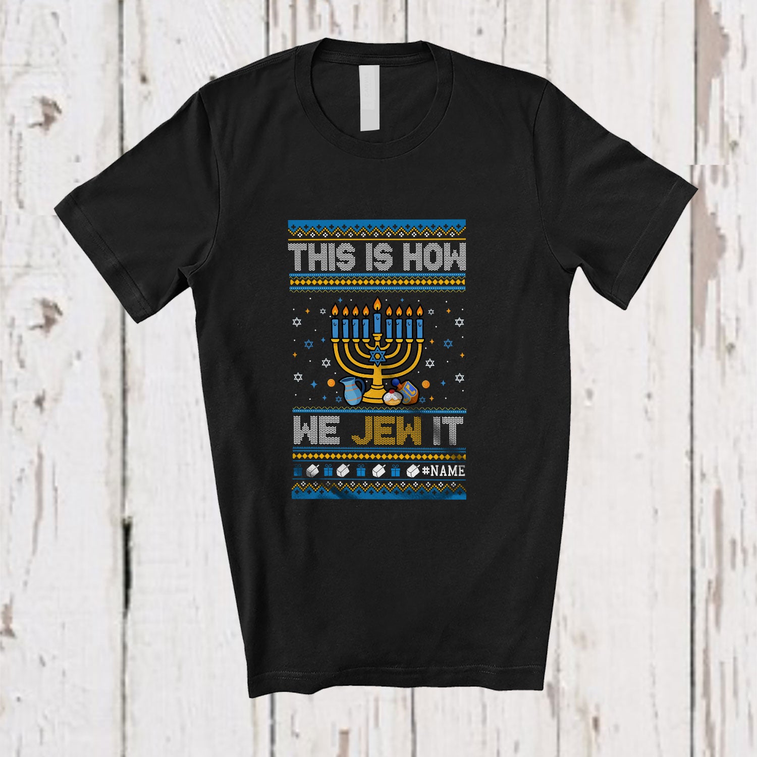 Personalized Custom Name This Is How We Jew It; Joyful Hanukkah Lights Sweater; Friends Family T-Shirt. This cotton t-shirt is a durable staple product with a classic fit. One of the most popular items, it has a relaxed style made for everyday and casual wear.