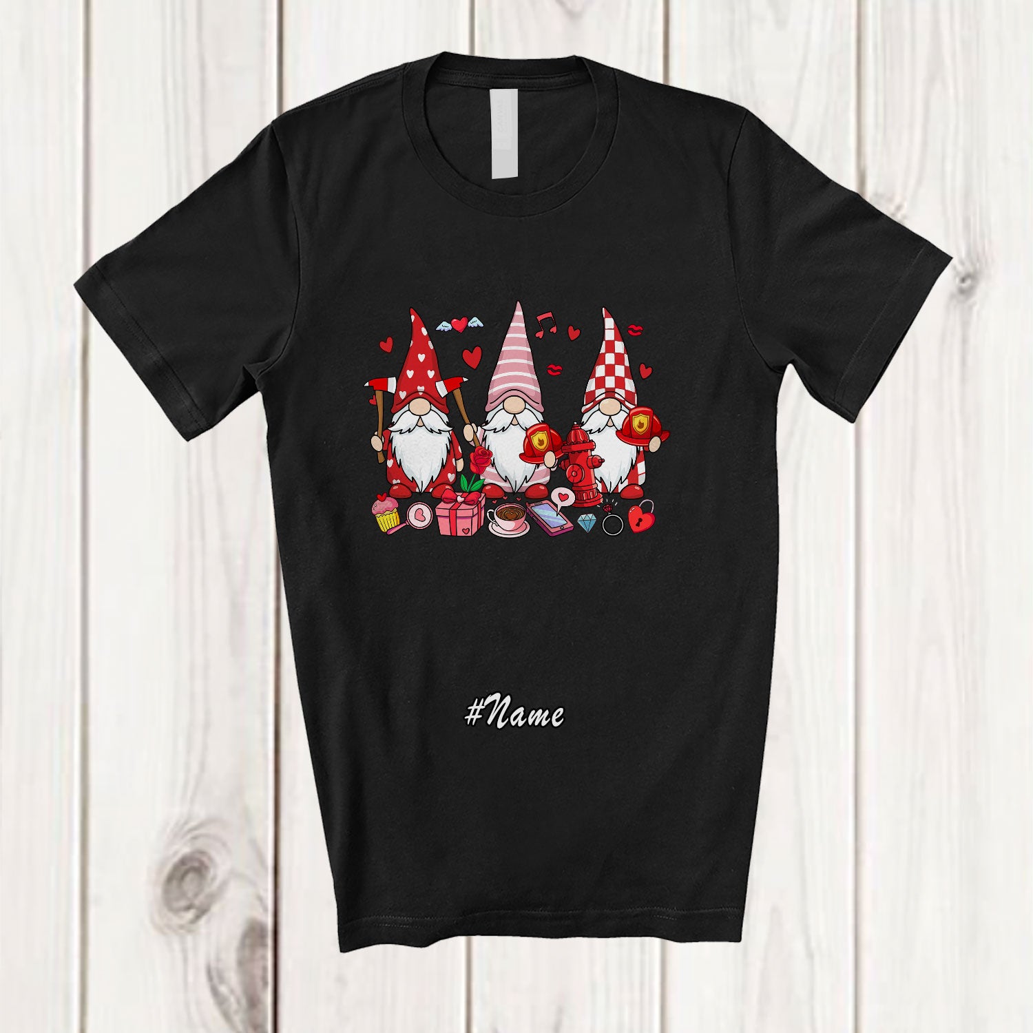• Personalized Custom Name Three Gnomes Firefighter Valentine; Lovely Gnomies Proud Jobs T-Shirt. This cotton t-shirt is a durable staple product with a classic fit. One of the most popular items, it has a relaxed style made for everyday and casual wear.
