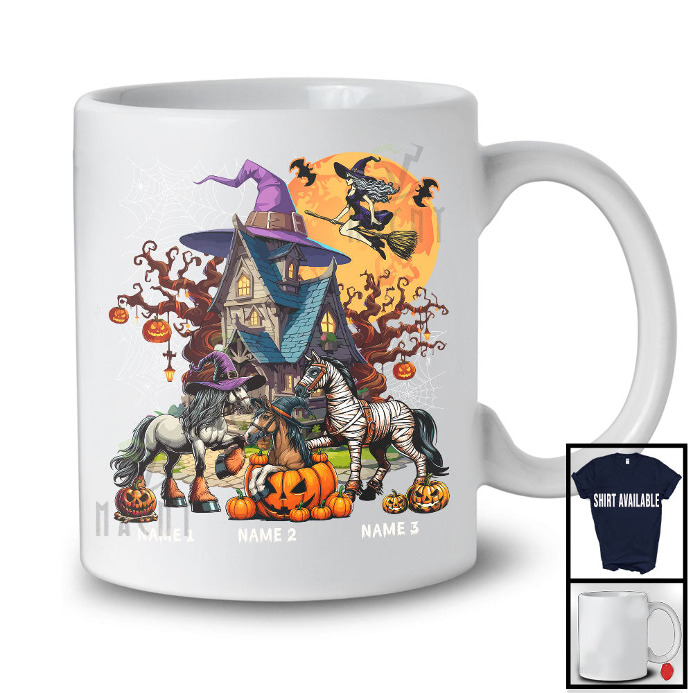 Personalized Custom Name Three Mummy Witch Horse, Scary Halloween Farm Farmer, Pumpkin T-Shirt. This cotton t-shirt is a durable staple product with a classic fit. One of the most popular items, it has a relaxed style made for everyday and casual wear.