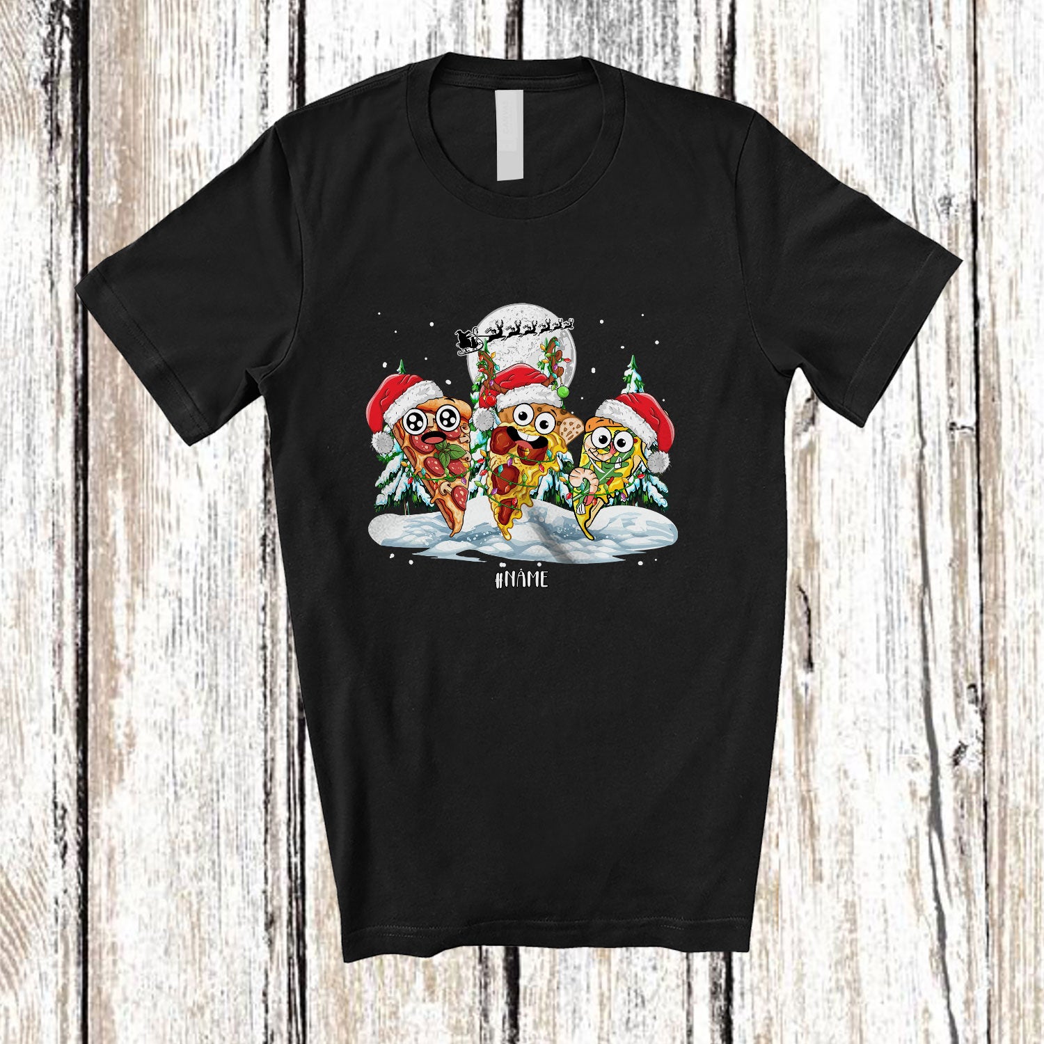 Personalized Custom Name Three Santa Reindeer Pizza; Lovely Christmas Moon Tree Food Lover T-Shirt