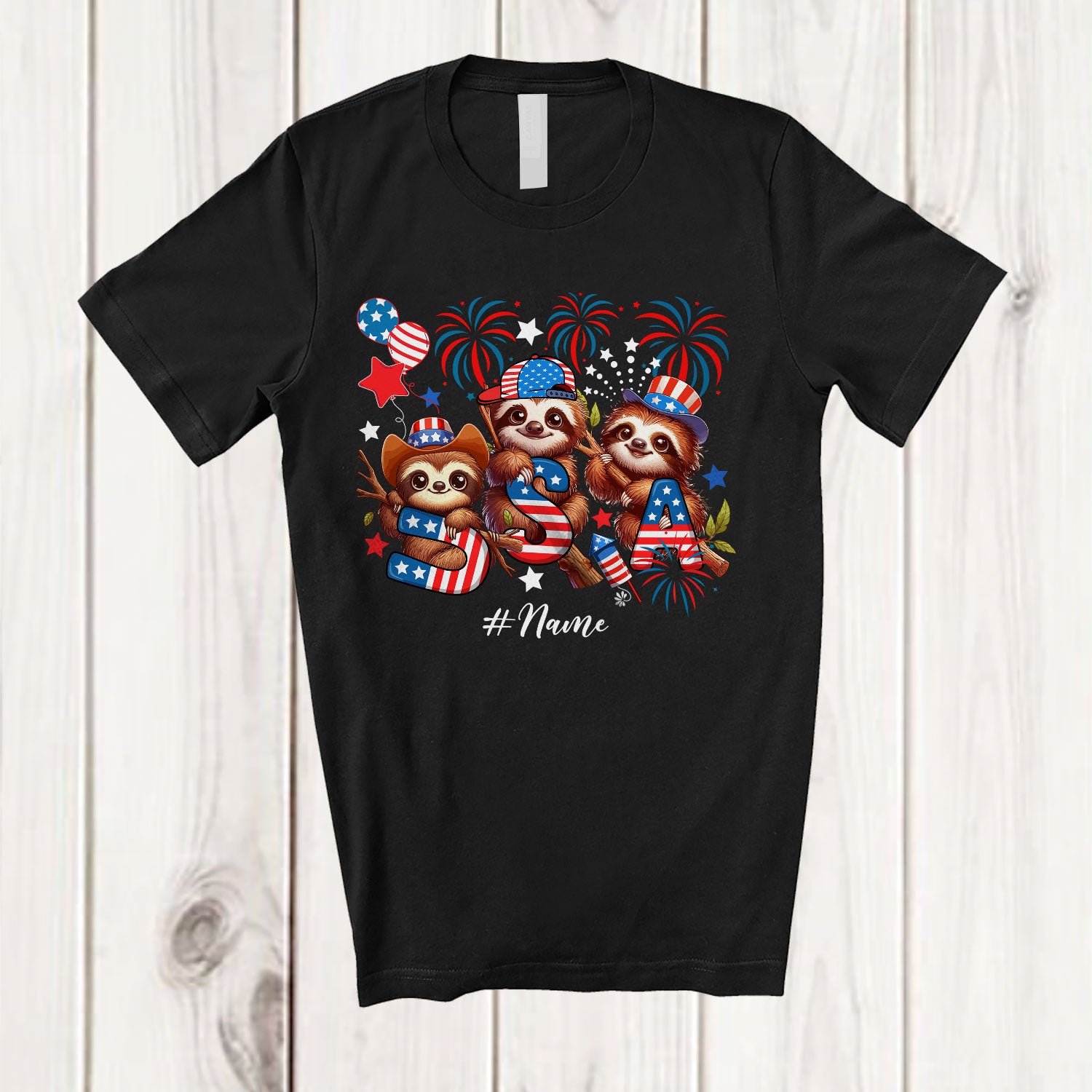 Personalized Custom Name Three Sloths Holding USA; Joyful 4th Of July American Flag Patriotic T-Shirt