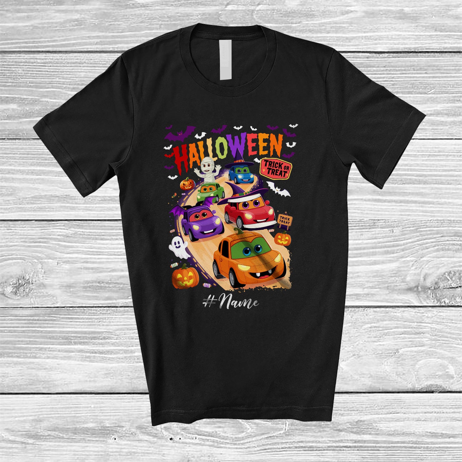 Personalized Custom Name Trick Or Treat; Amusing Halloween Cartoon Car; Boys Family T-Shirt. This cotton t-shirt is a durable staple product with a classic fit. One of the most popular items, it has a relaxed style made for everyday and casual wear.