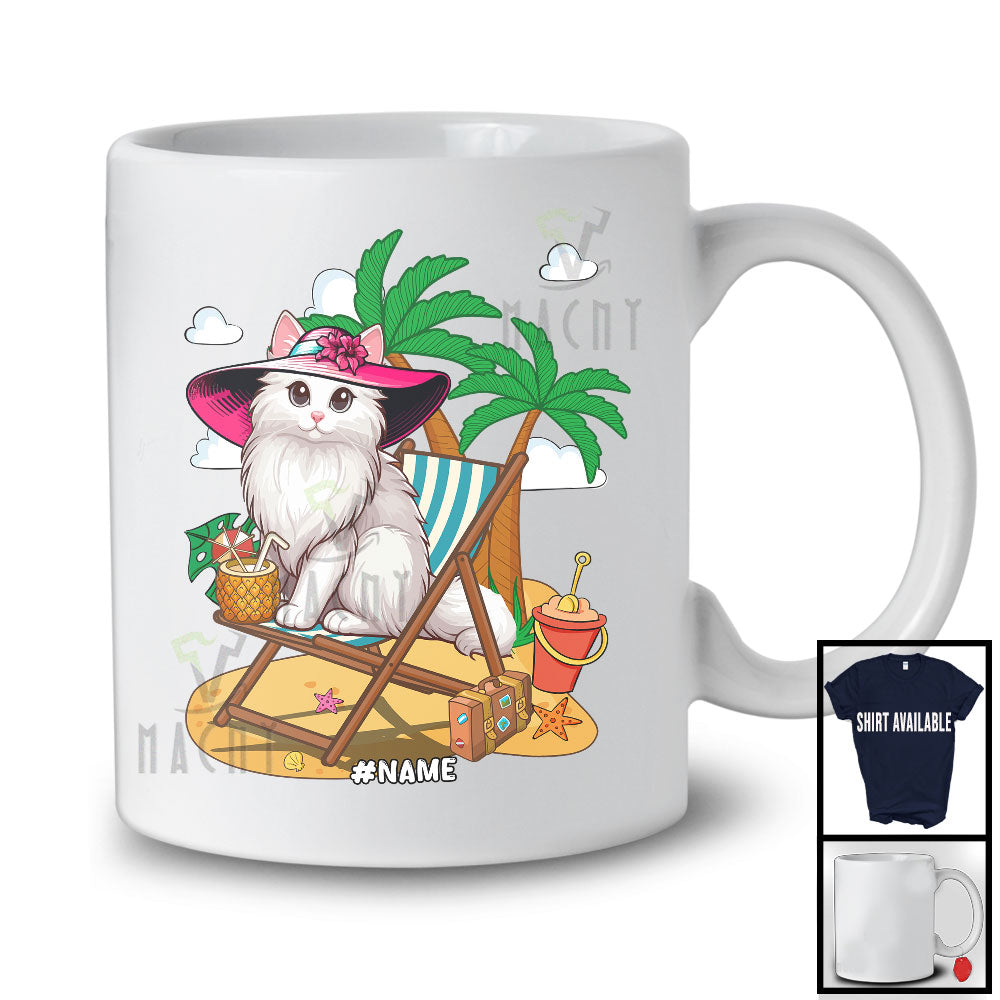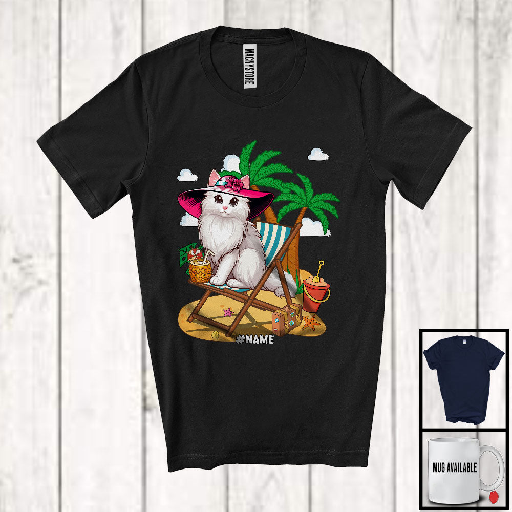 Personalized Custom Name Turkish Angora On Beach, Lovely Summer Vacation Kitten Palm Tree T-Shirt
