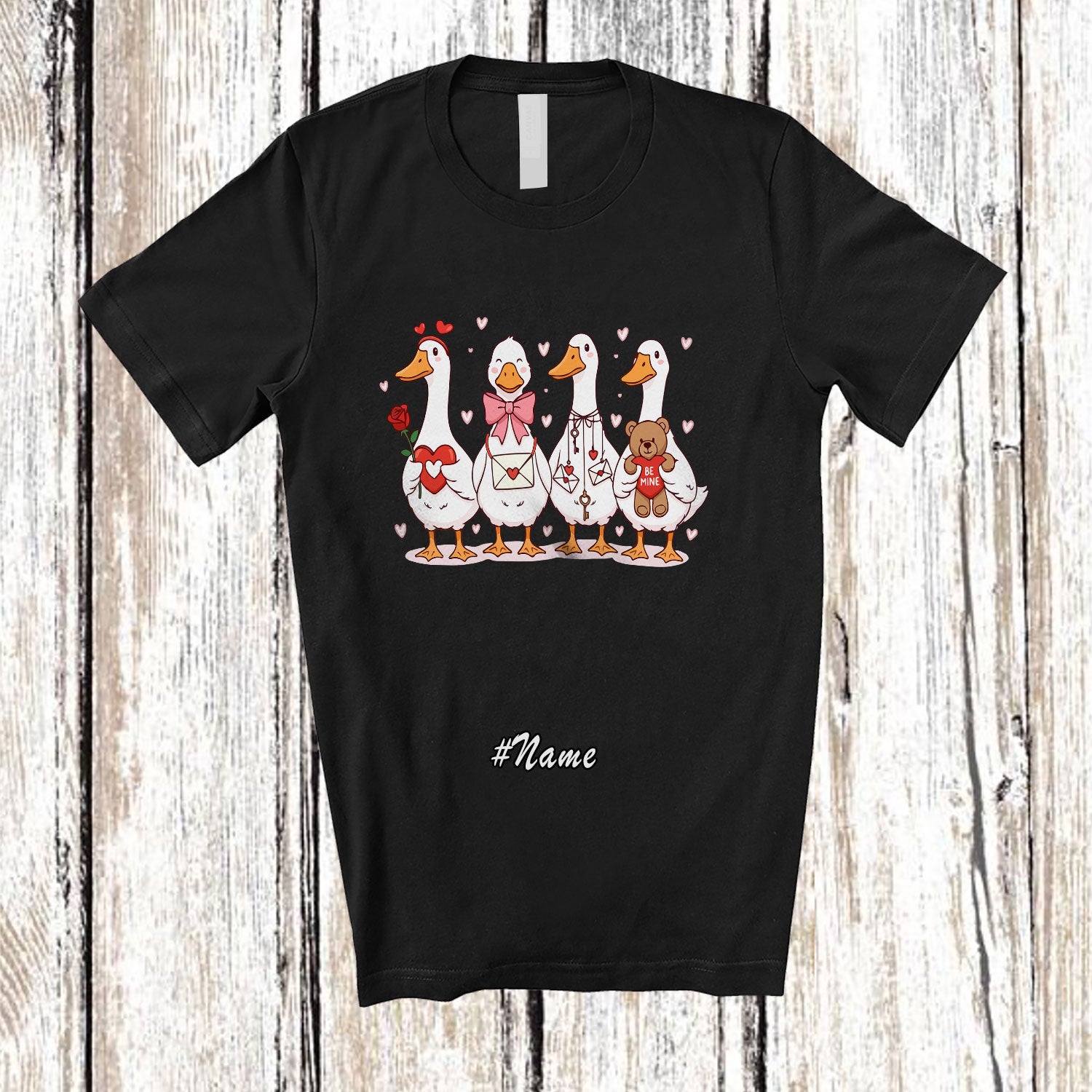 • Personalized Custom Name Valentine Goose Collection; Lovely Goose Hearts Flowers Farmer T-Shirt. This cotton t-shirt is a durable staple product with a classic fit. One of the most popular items, it has a relaxed style made for everyday and casual wear.