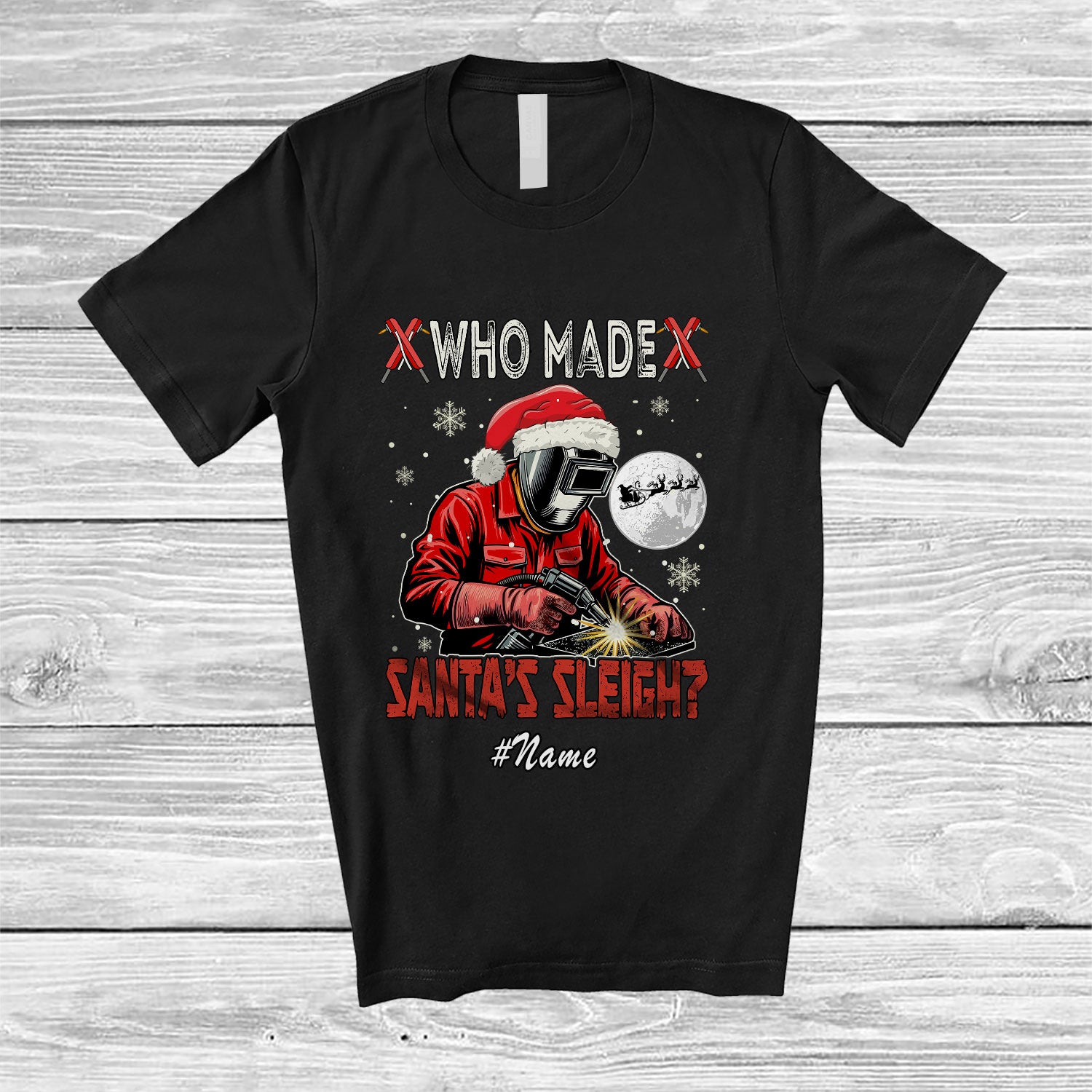 • Personalized Custom Name Who Made Santa's Sleigh; Humorous Christmas Welder Santa X-mas Family T-Shirt. This cotton t-shirt is a durable staple product with a classic fit. One of the most popular items, it has a relaxed style made for everyday and casual wear.